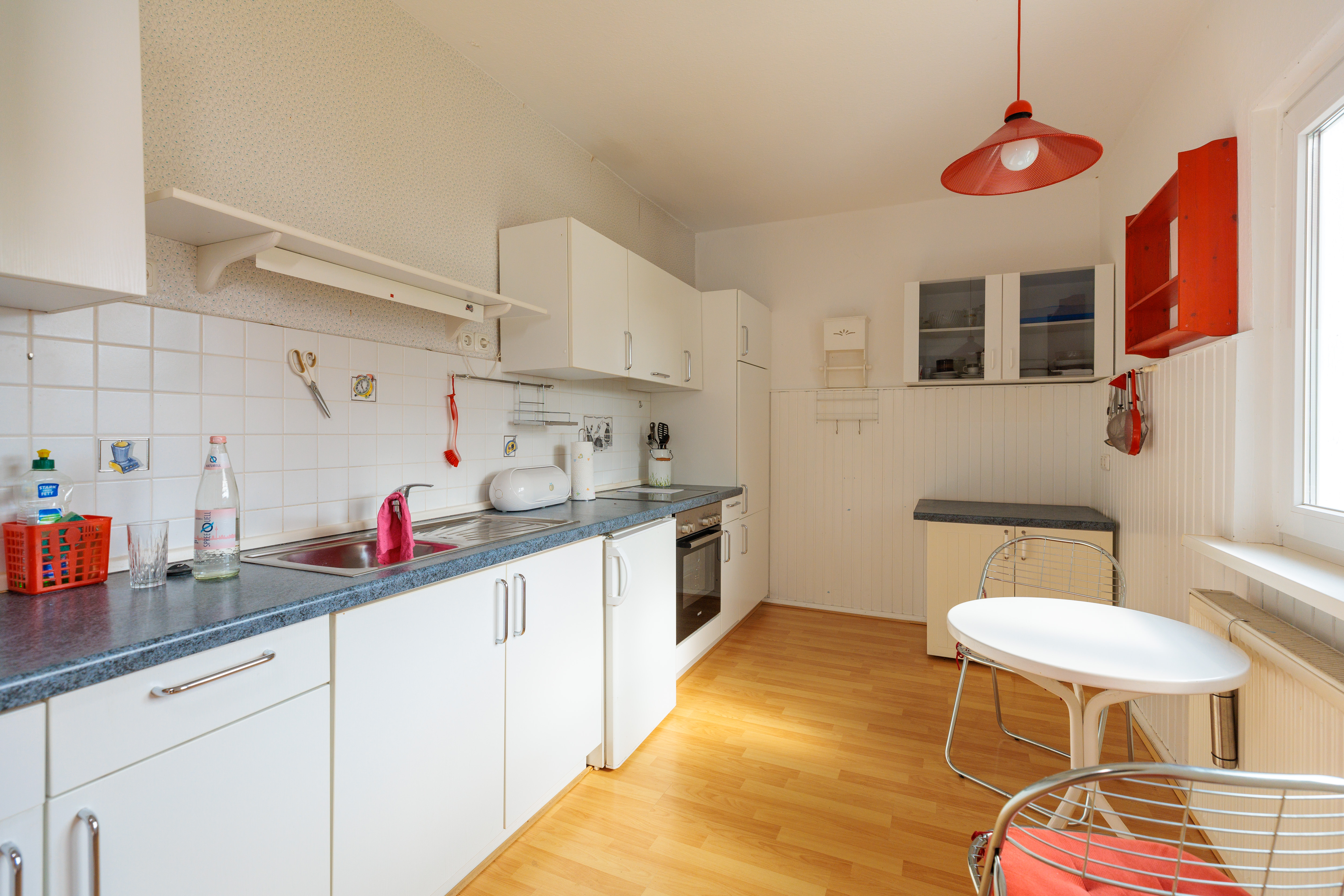 - Halbhoch gefliest im Nass- und Spritzbereich in der Küche.