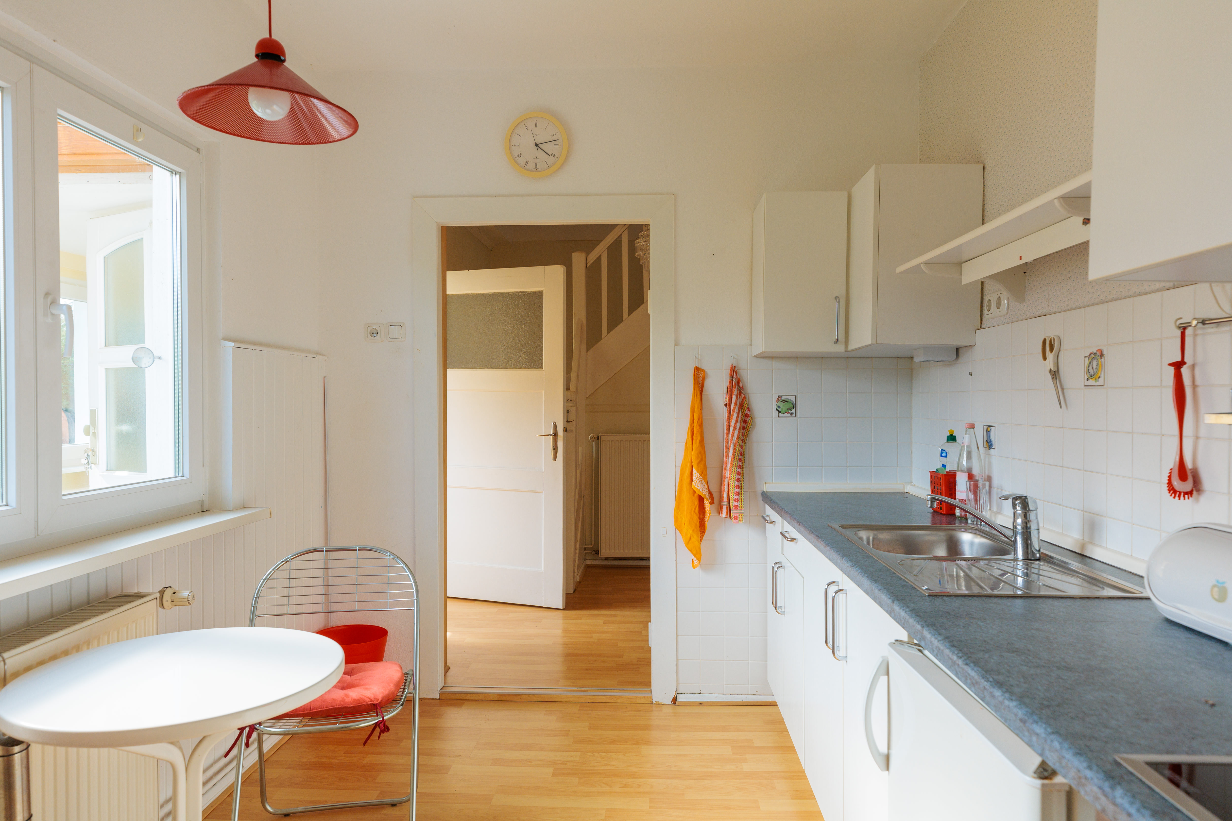 Zurück im Flur erreicht man die geräumige Küche. Diese ist mit einer Einbauküche ausgestattet, die ein Ceranfeld, einen Backofen und zwei Kühlschränke umfasst. Ein Kühlschrank kann entfernt werden und kann damit den Platz für einen Geschirrspüler frei geben. Eine kleine Frühstücksecke am Fenster lädt dazu ein, den Morgenkaffee mit Blick in den Garten zu genießen.