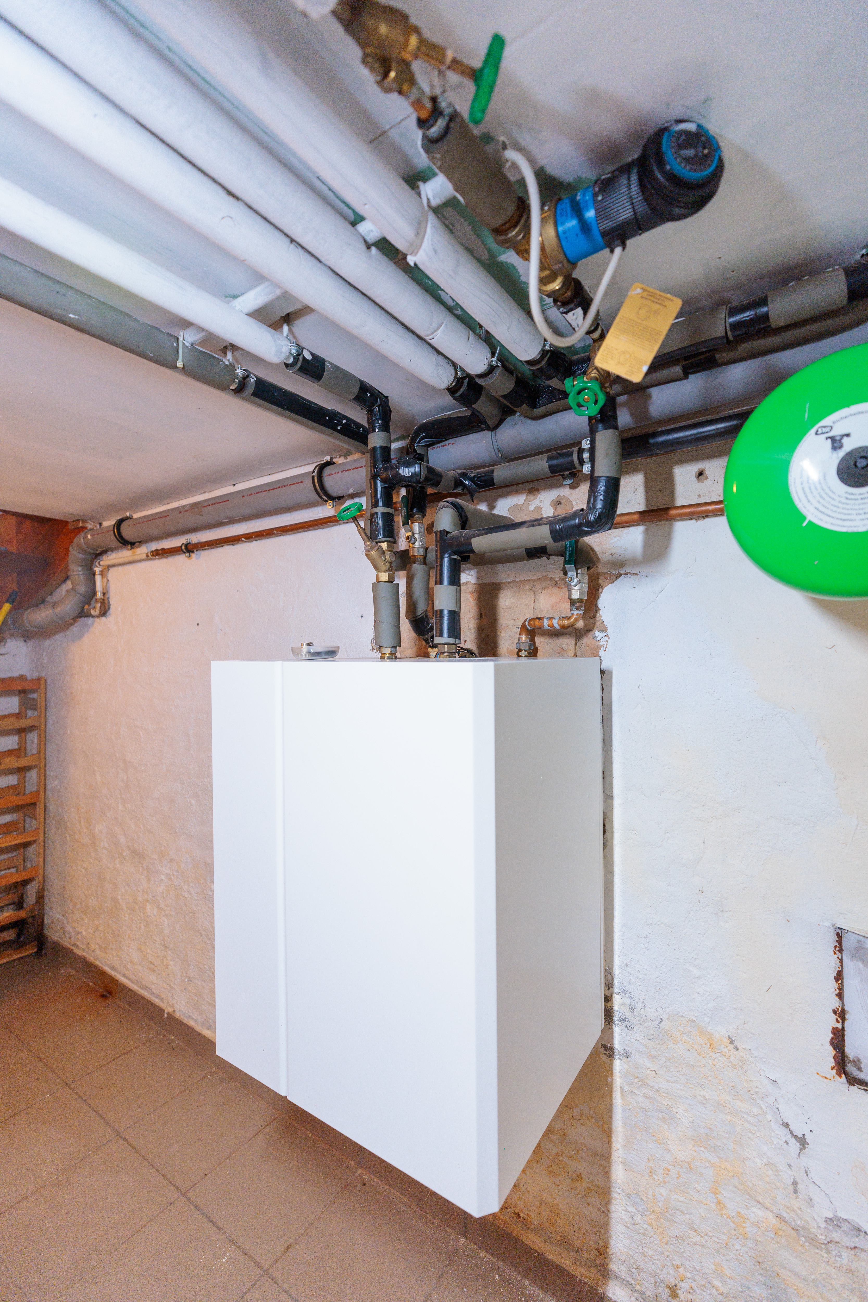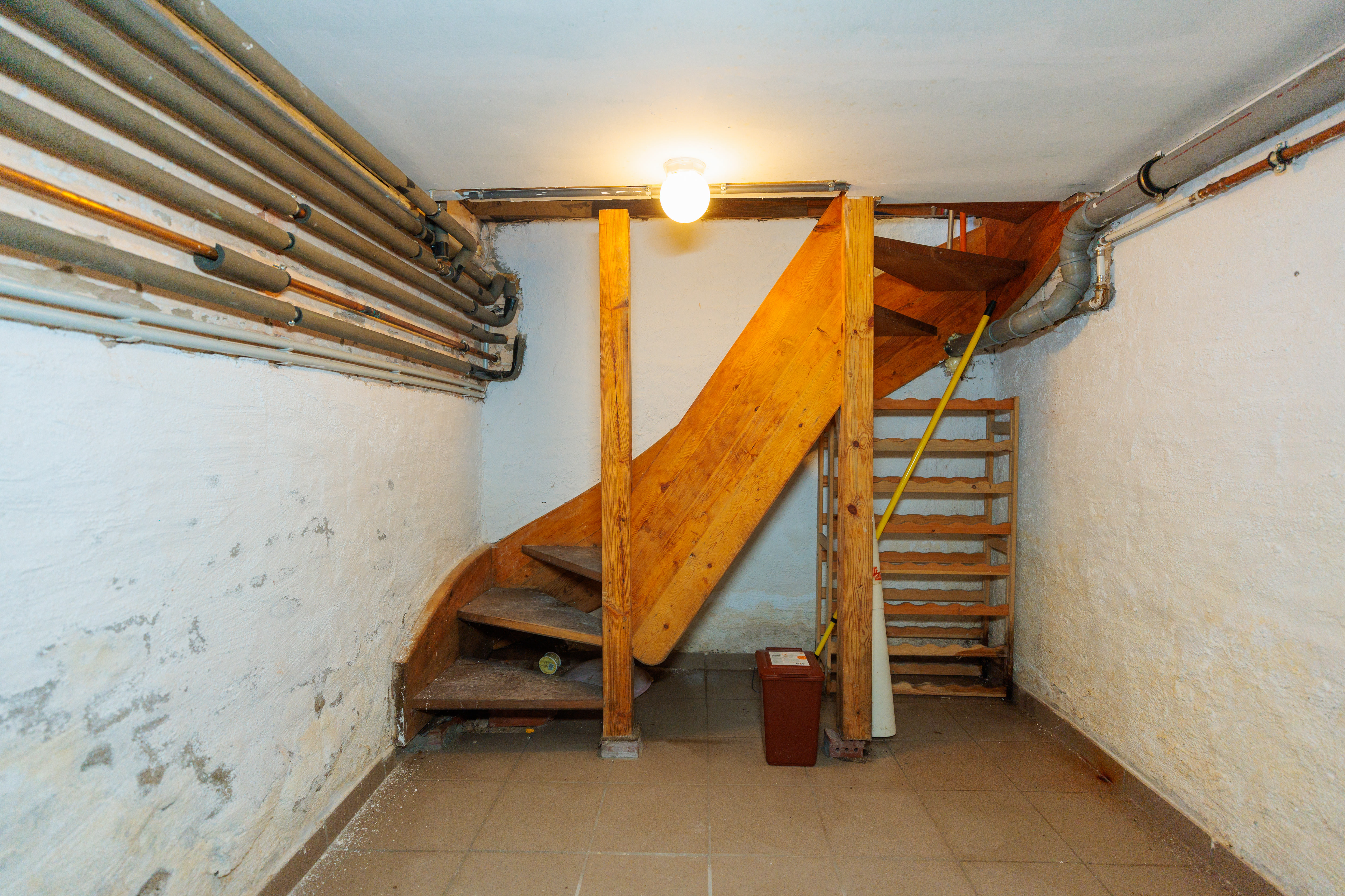 Unter der Treppe befindet sich ein Teilkeller. Hier ist der Warmwasserspeicher untergebracht, und es gibt ausreichend Platz für die Lagerung von Vorräten.
