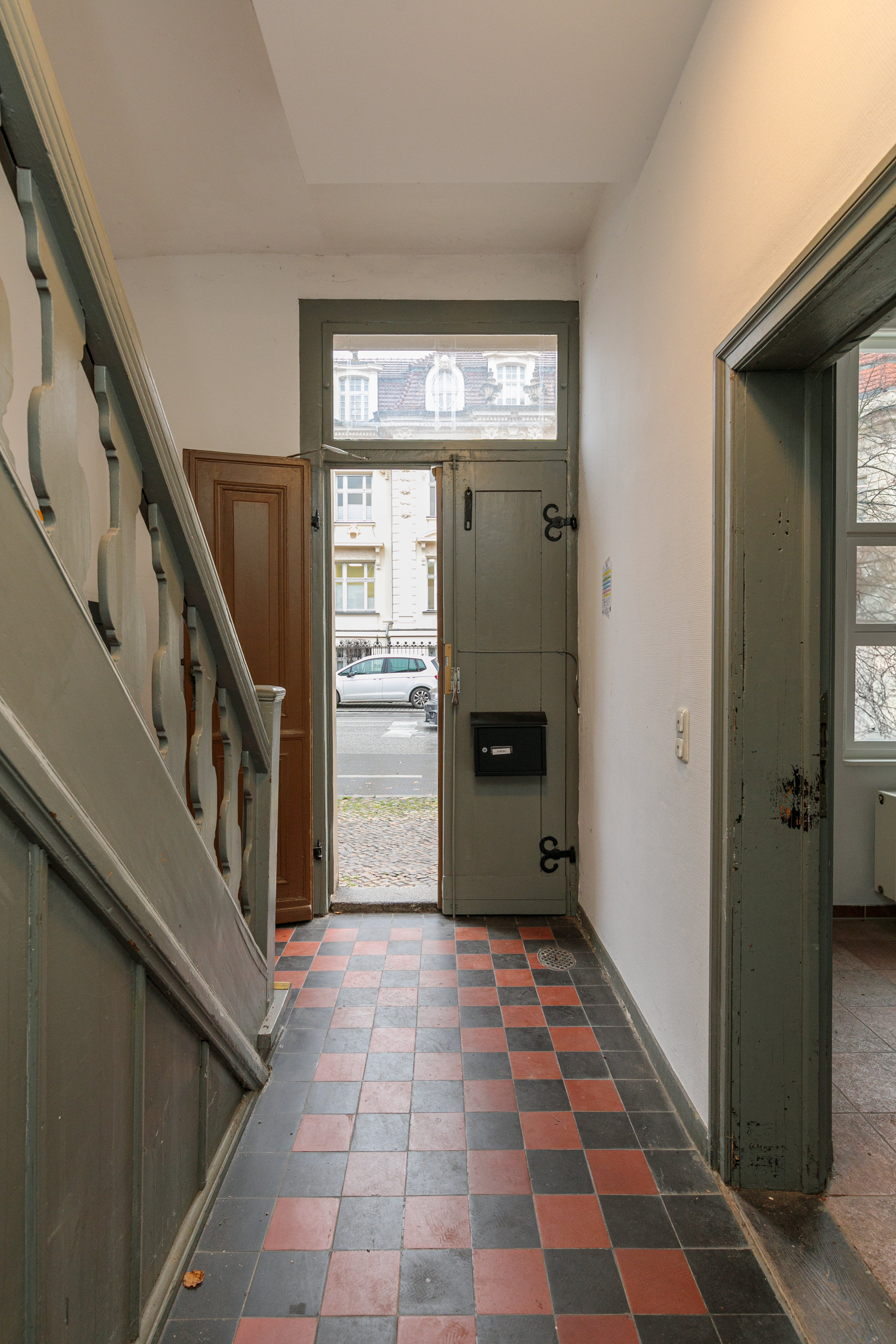 - Eingangsbereich: Die historische Holztür und die typischen Fliesen im Flur bewahren den ursprünglichen Charakter des Hauses.