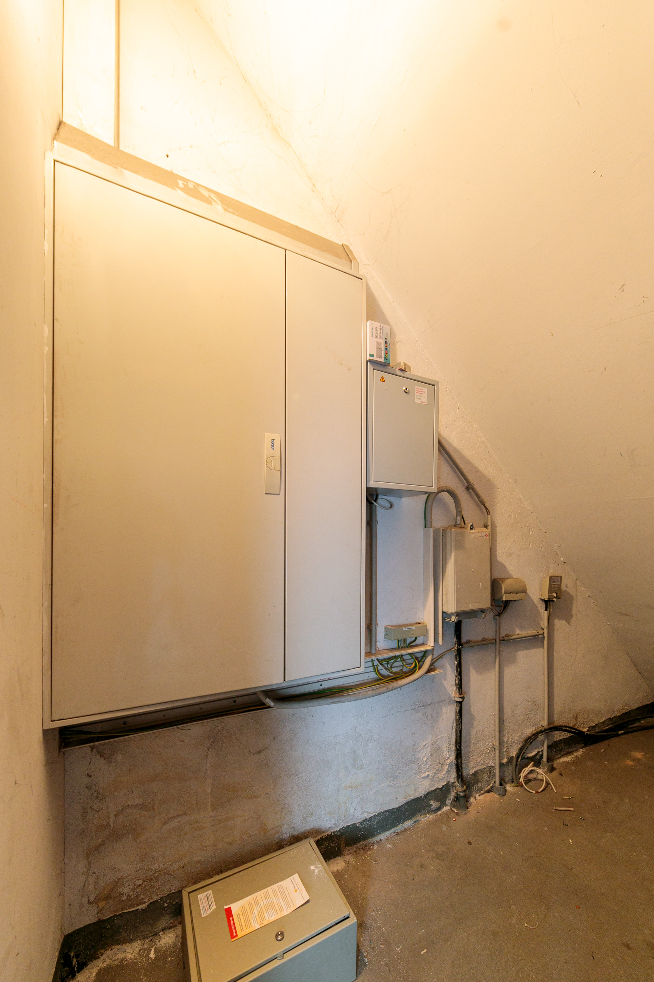 - Optimierte Raumnutzung: Der Bereich unter der Treppe wurde effizient genutzt und beherbergt Hausanschlüsse, die Heizung und ein Gäste-WC für die Gewerbeeinheit.