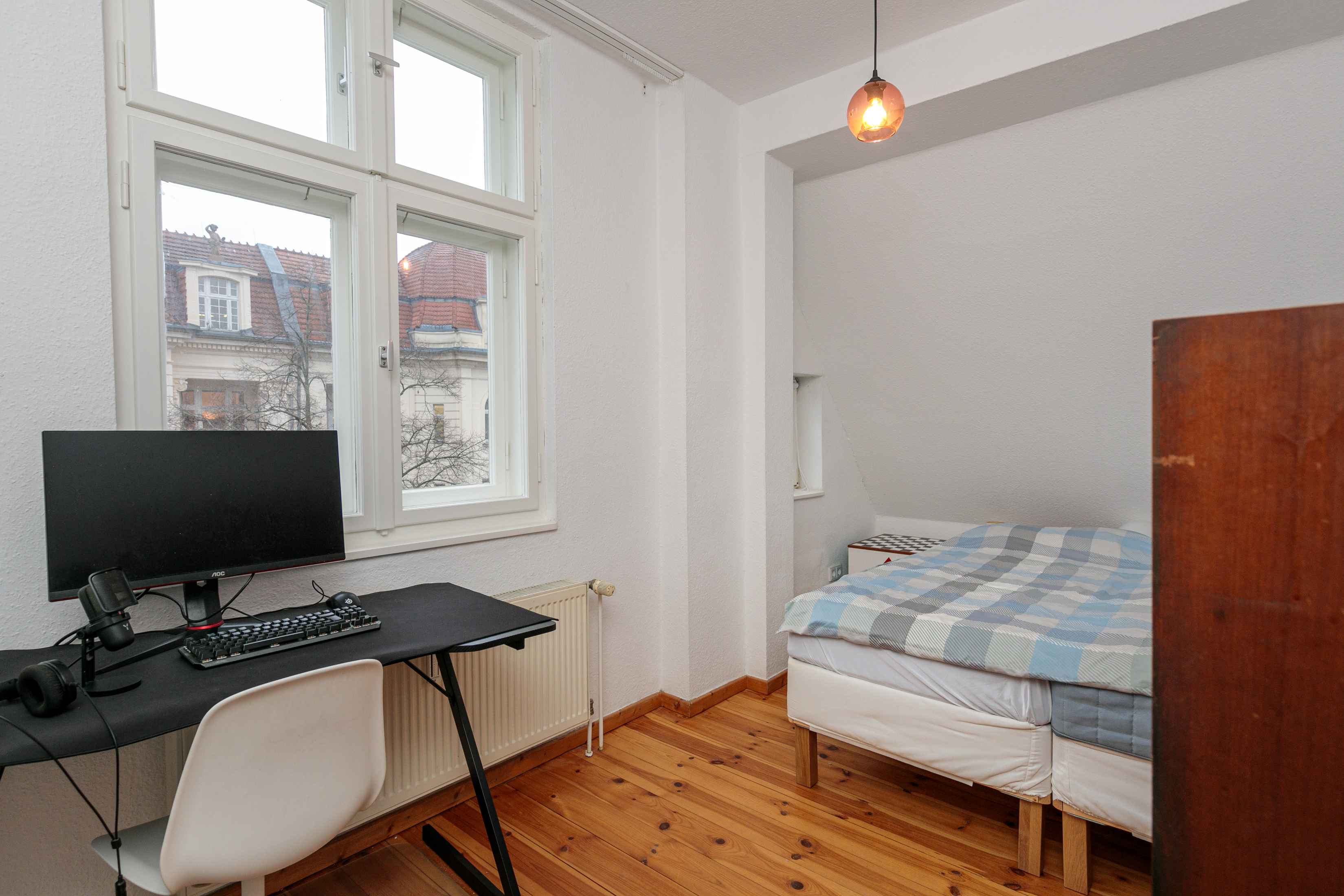 - Zimmer: Die Wohnung verfügt über zwei weitere gut geschnittene Räume, die als Schlafzimmer genutzt werden können. Beide Zimmer bieten einen schönen Blick in den grünen Innenhof. Eines der Zimmer hat eine halboffene kleine Bibliothek, die alternativ auch als Ankleidezimmer genutzt werden kann. Bei diesem Zimmer kann auch ein Balkon mit ruhiger Innenhoflage angebaut werden; die Genehmigung durch das Amt für Denkmalschutz liegt dafür schon vor.
