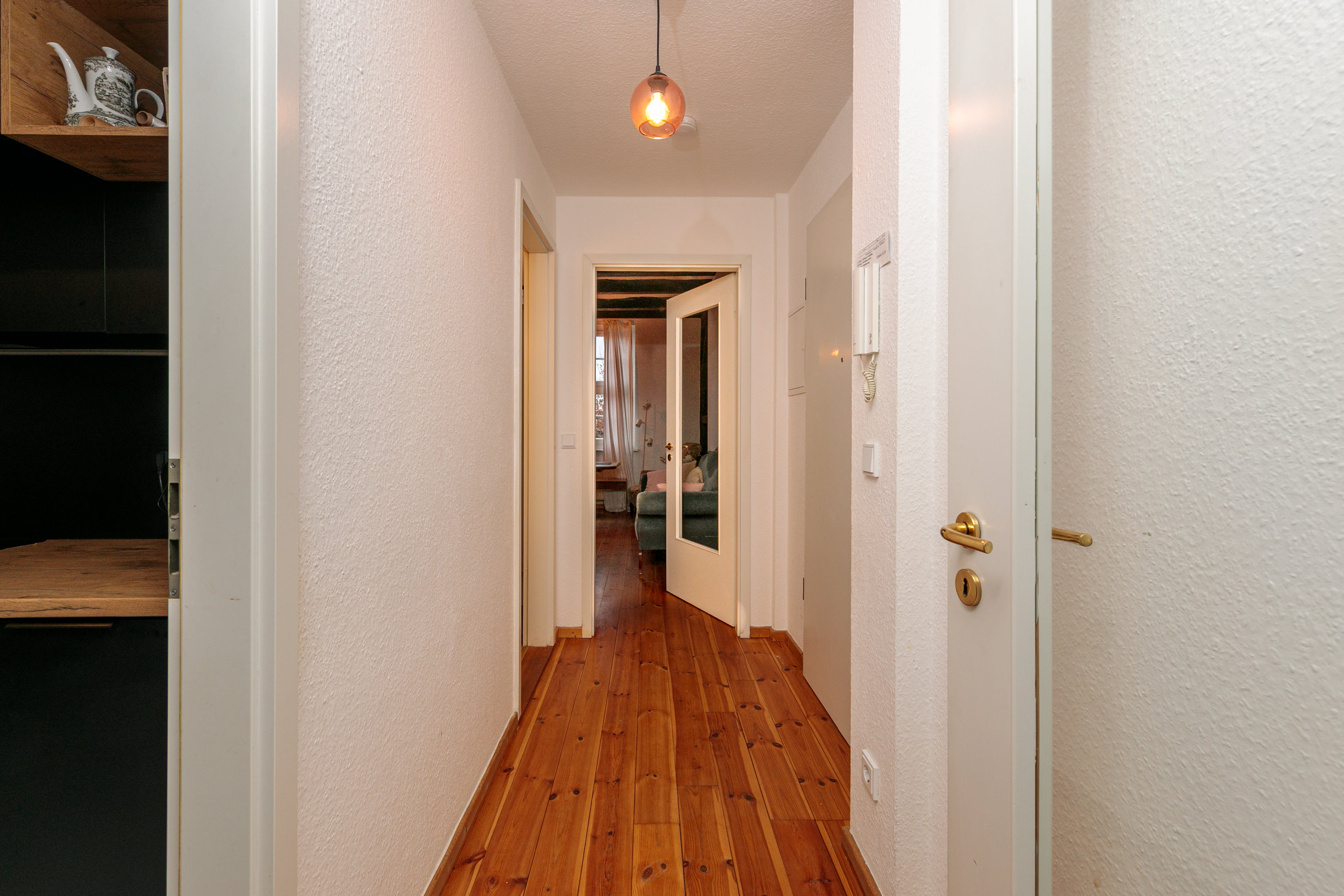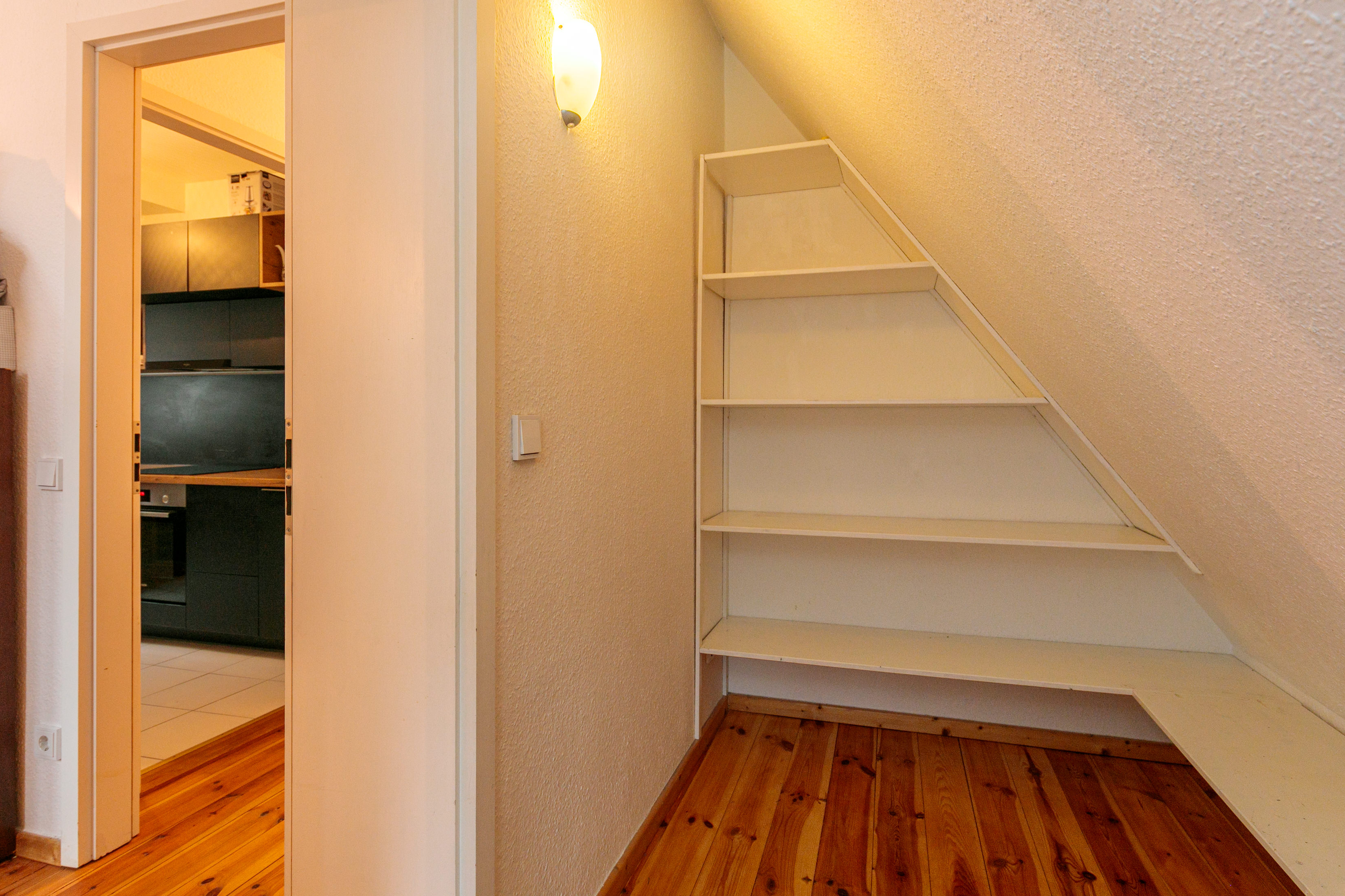 - Eingangsbereich: Direkt hinter der Wohnungstür befindet sich ein kleiner Flur, der rechterhand über einen Abstellraum verfügt. Dieser eignet sich als Garderobe oder Stauraum.