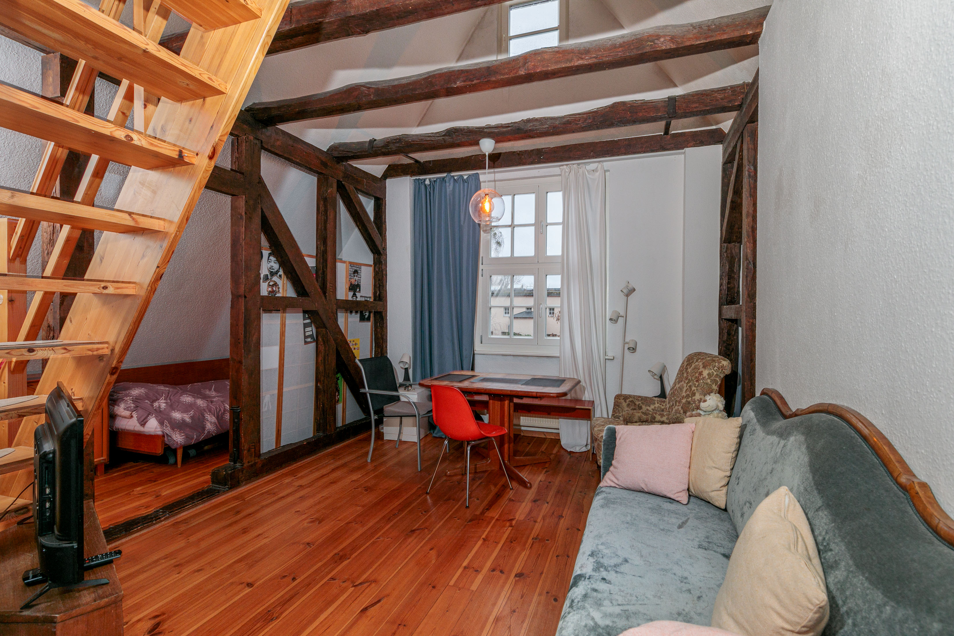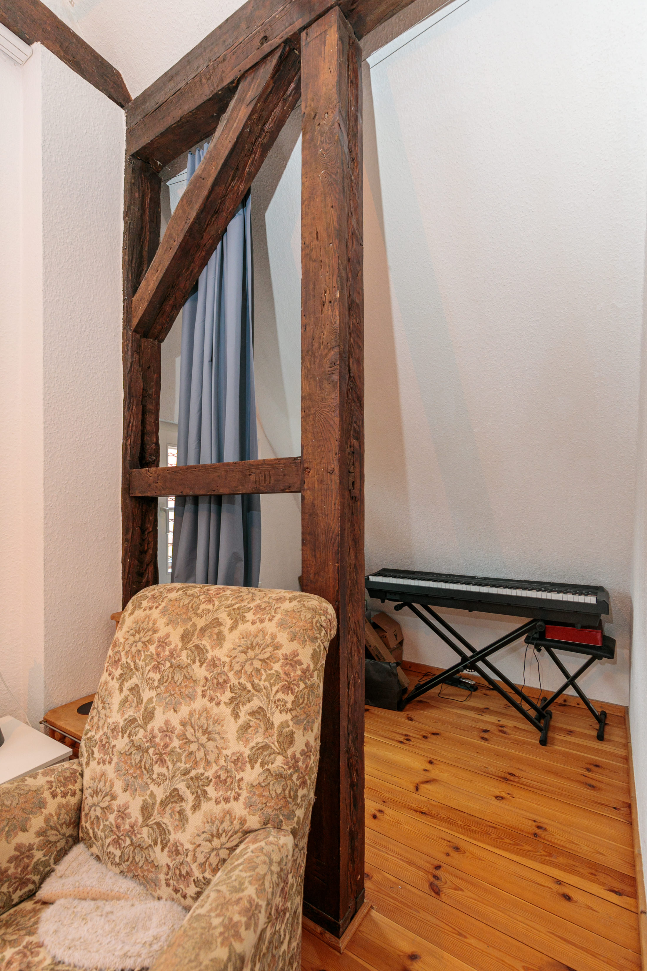 - Originale offene Dachbalken in der Dachgeschosswohnung.