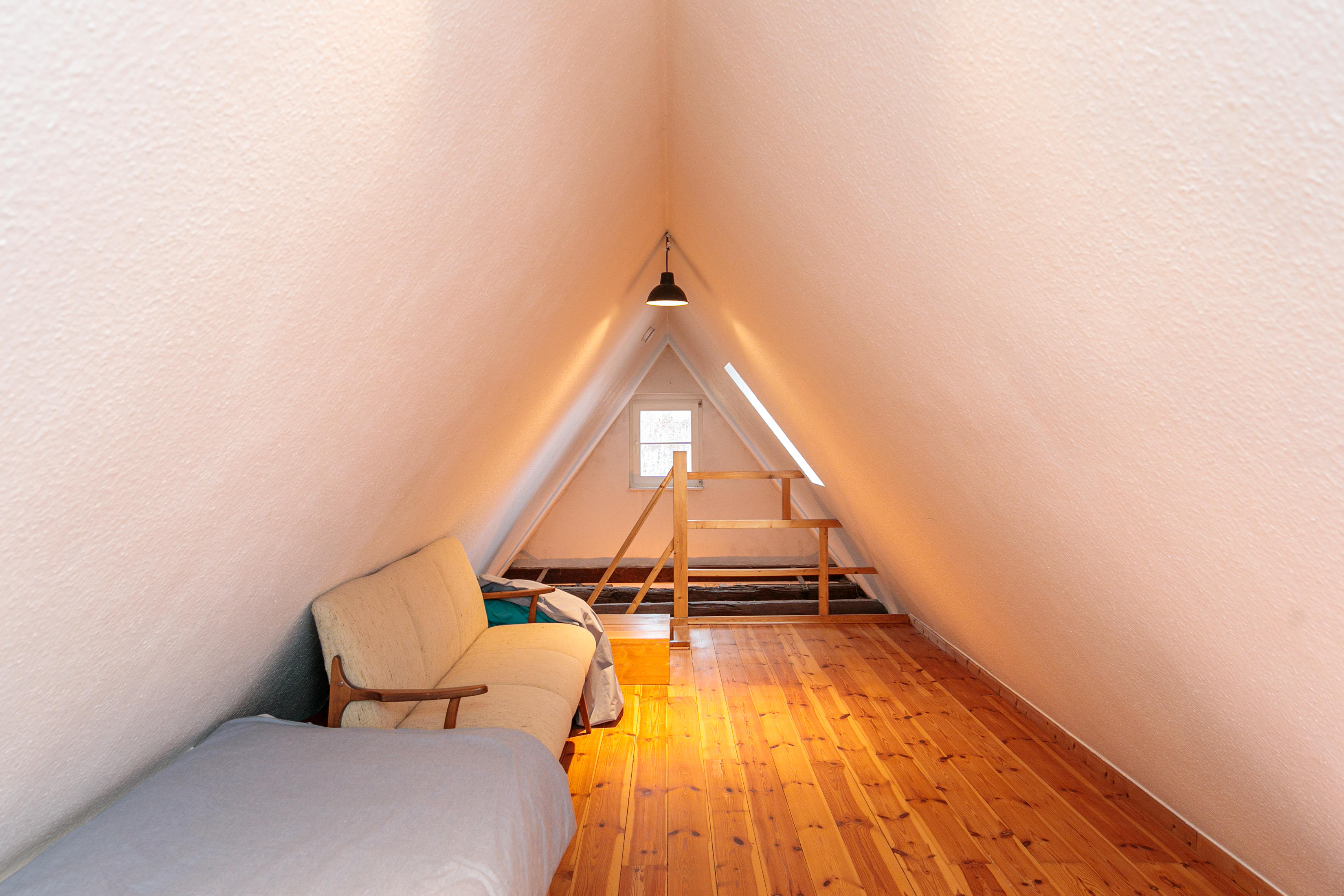 - Studiobereich (obere Ebene): Eine Holztreppe führt in den ausgebauten Studiobereich. Dieser Raum kann vielseitig genutzt werden, z. B. als zusätzlicher Schlafbereich, Hobbyraum oder Atelier.