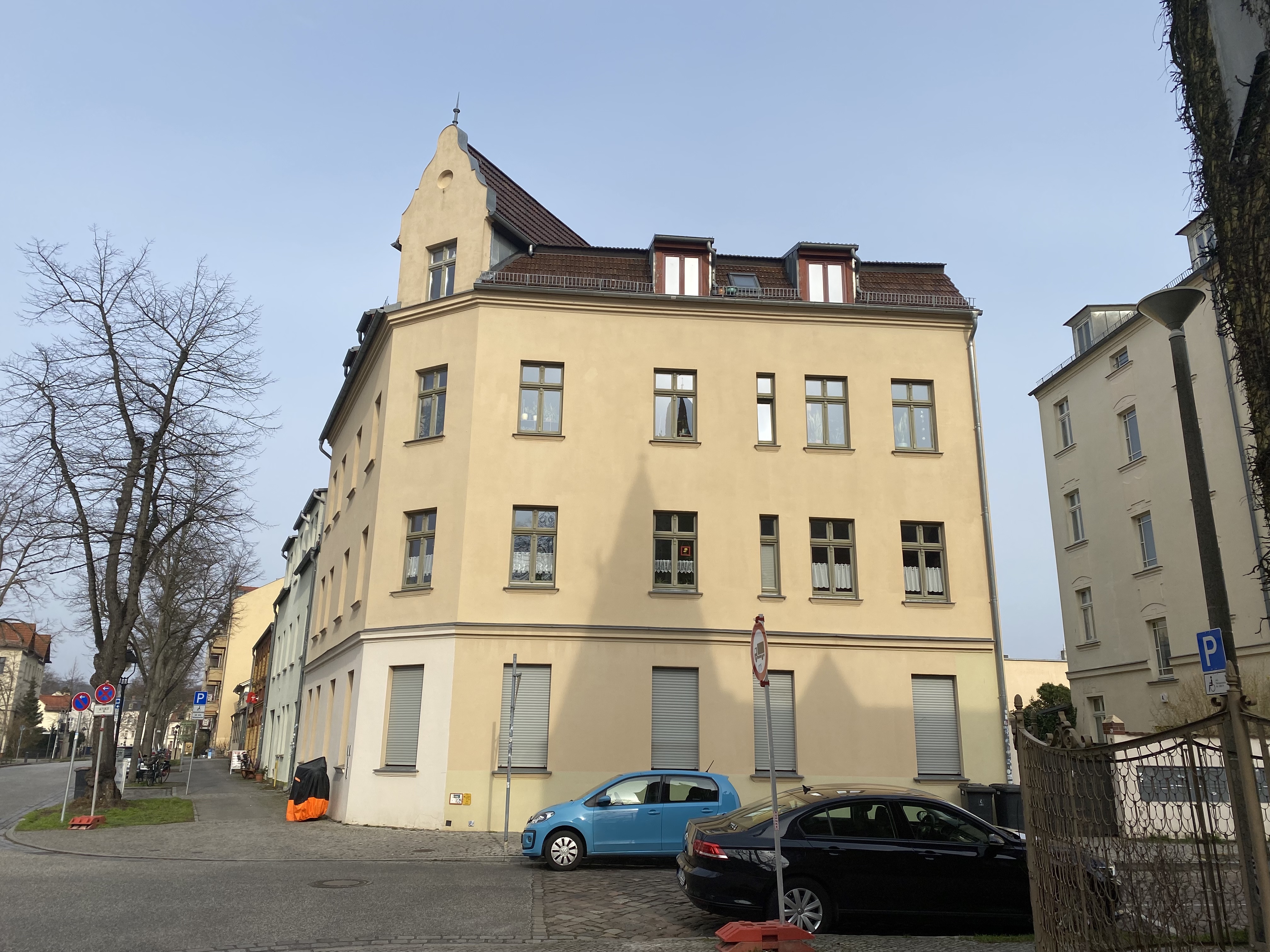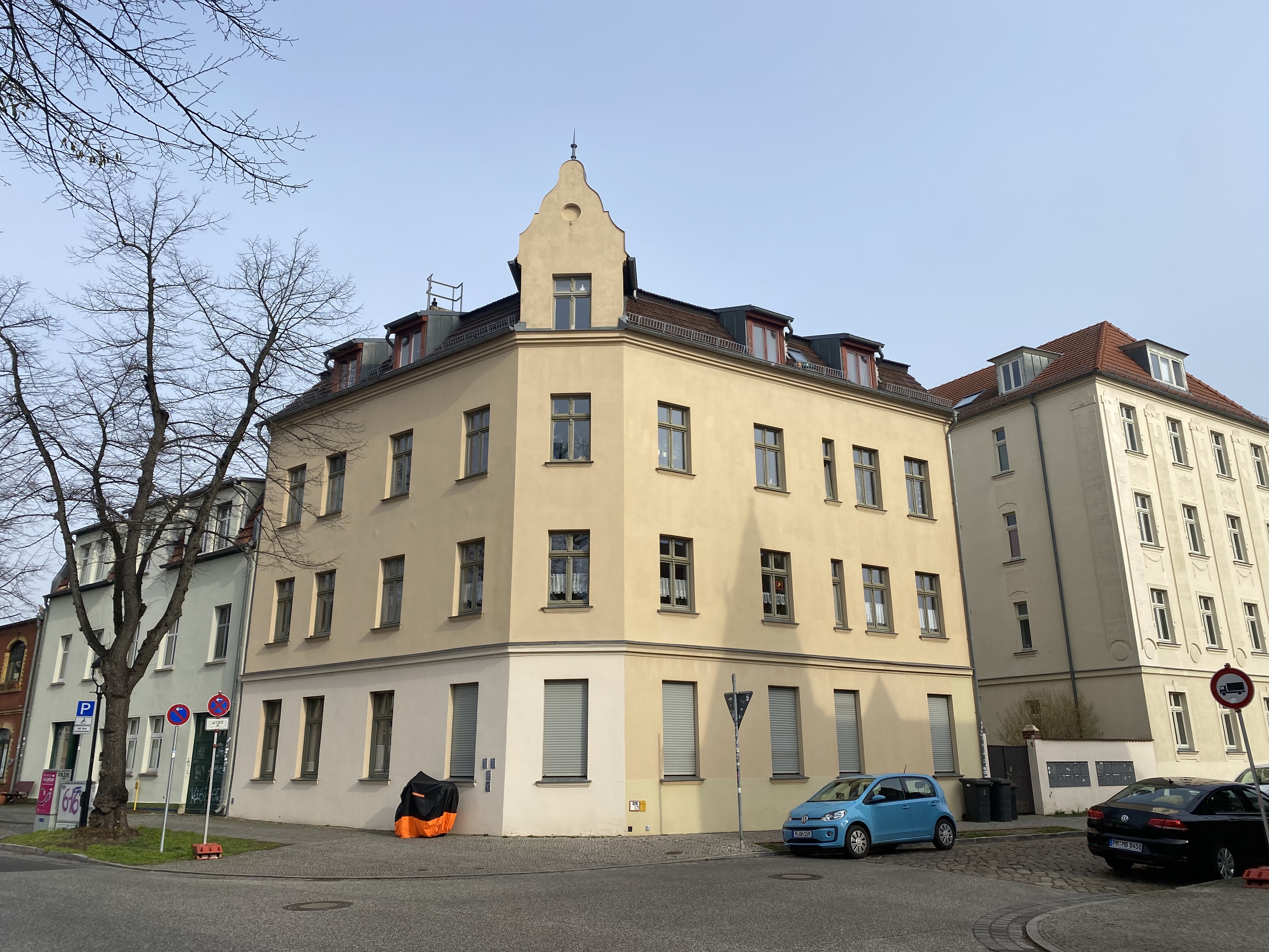 Die 53 m2 große Wohnung befindet sich im zweiten Obergeschoss eines sanierten Eckaltbaus aus dem Jahr 1930. Das Vorderhaus, in dem die 2-Zimmer-Wohnung liegt, besteht aus acht, das Hinterhaus aus neun Wohneinheiten. Die Gebäude wurden 2000/2001 aufwändig kernsaniert, wobei Originalelemente erhalten und instandgesetzt wurden und dem Gebäude heute historischen Charme verleihen. Auch alle Wohnungen wurden stilgerecht wiederhergestellt.