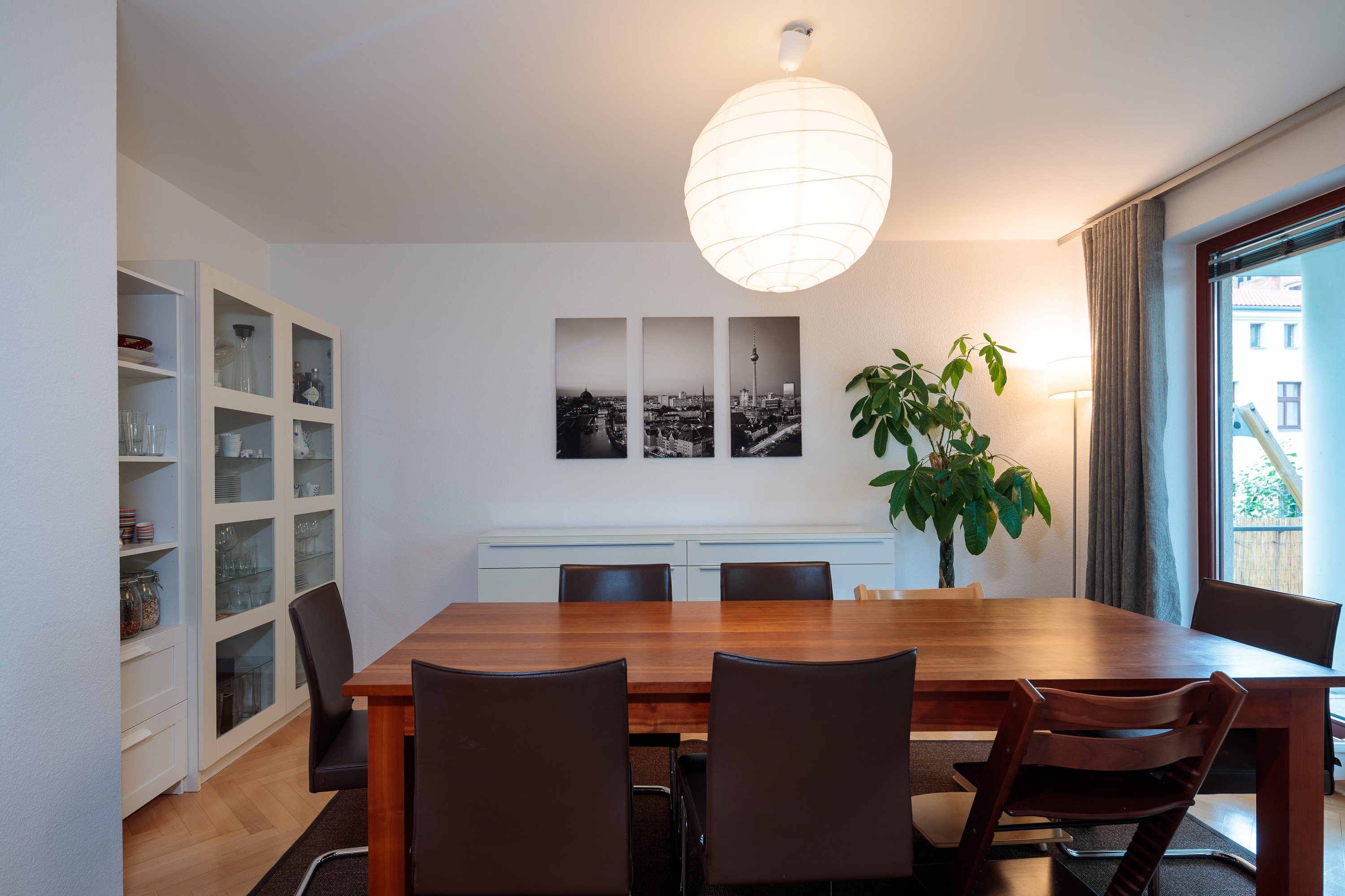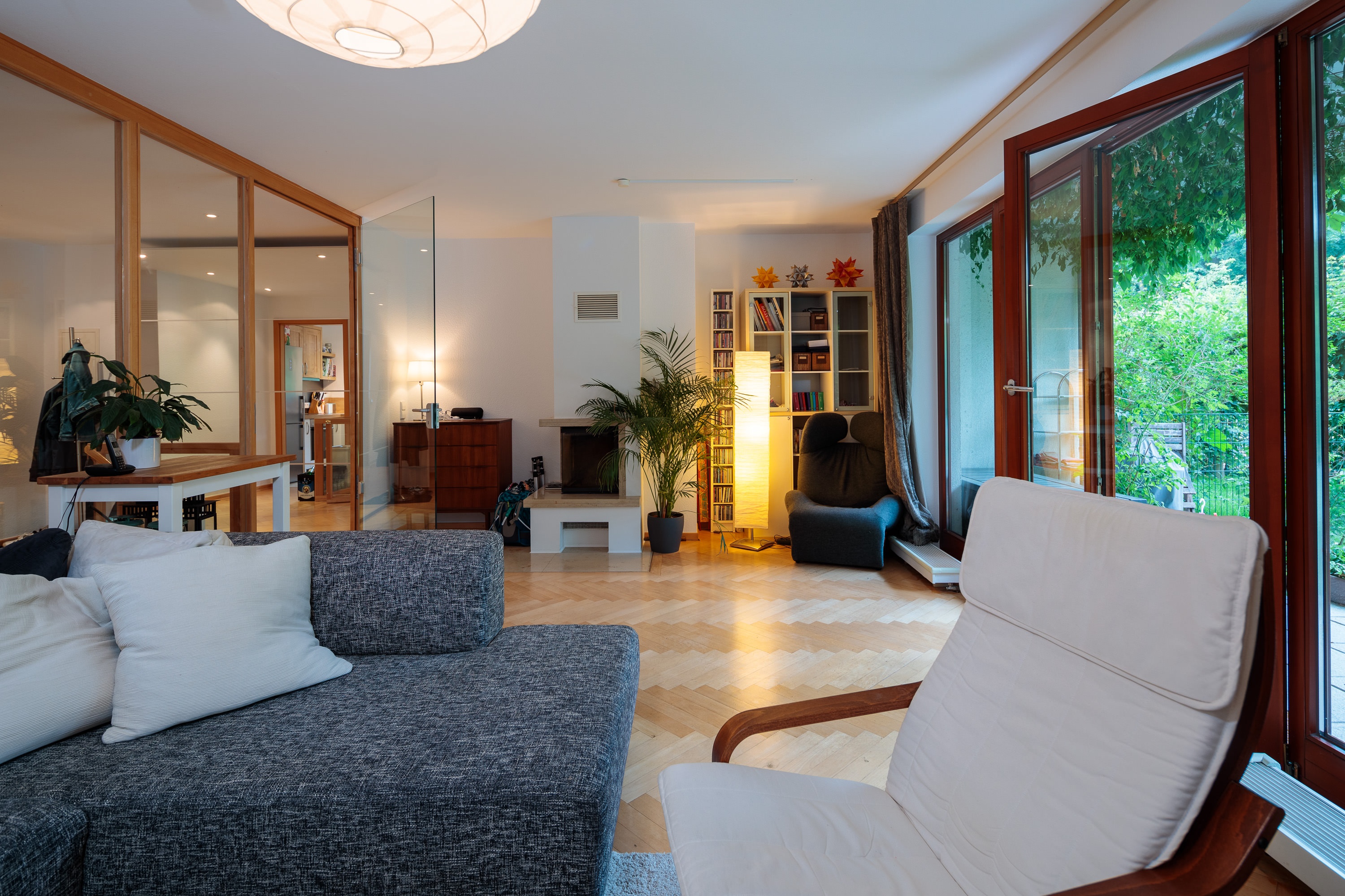 Da das Haus, in dem sich die schöne Wohnung befindet, in zweiter Reihe liegt, ist es umgeben von Stille und Ruhe. Das Grundstück grenzt an den Wald.