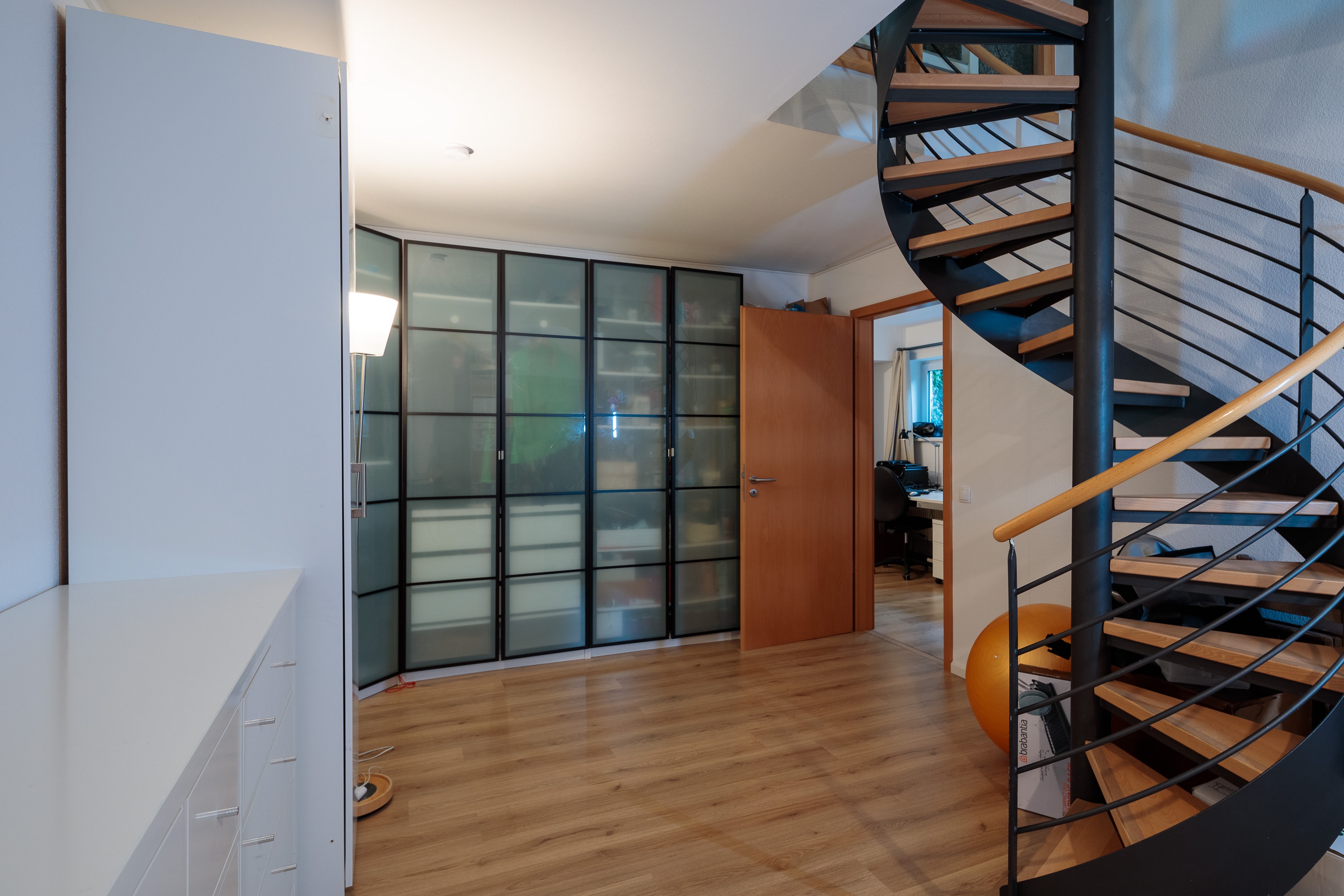 Die Wohnung verfügt über Parketboden im Obergeschoss und Bodenfliesen in der Küche und den Bädern.