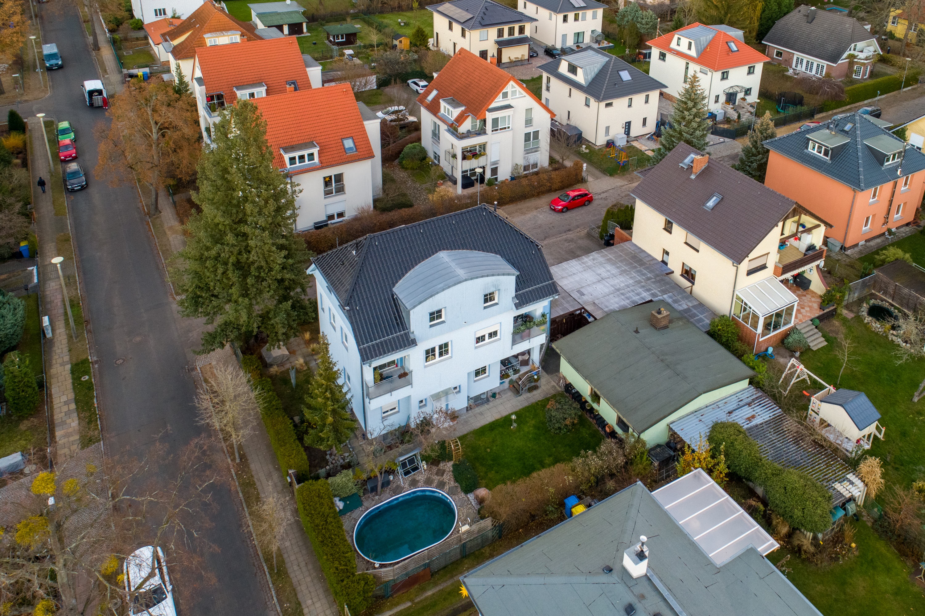 Das Wohn- und Gartenhaus liegt in gehobener Lage in Babelsberg-Nord, in einer ruhigen Seitenstraße, umgeben von viel Grün und der Griebnitzsee ist nah. Die Nachbarschaft ist geprägt von einzelstehenden Einfamilienhäusern mit Gartengrundstücken. In unmittelbarer Nachbarschaft befindet sich eine Kita, die Katholische Mariengrundschule und ein Edeka-Markt. Und auch die Bio-Bäckerei Fahland und Blumen-Sühr, der wohl schönste Blumenladen von ganz Potsdam, ist nicht weit.