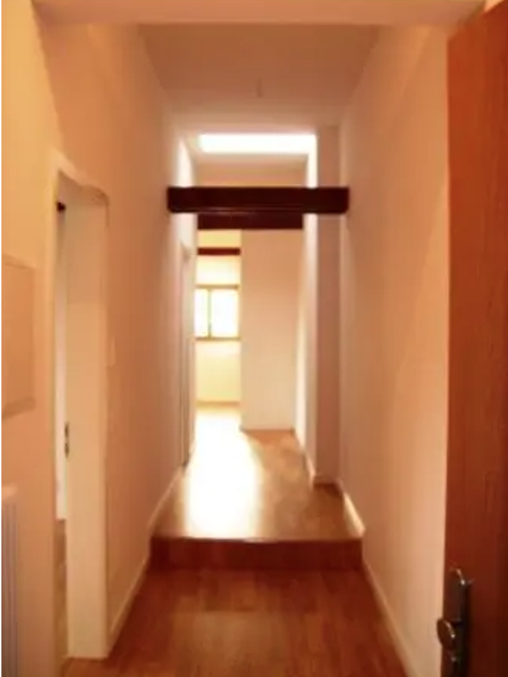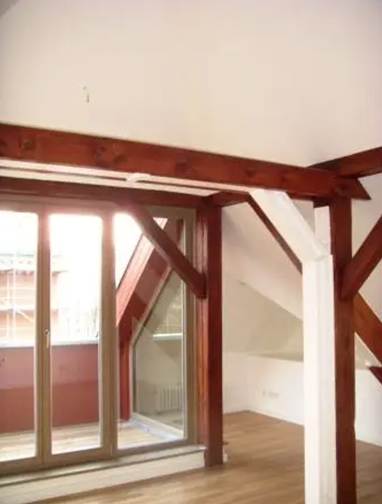 Beim Betreten der Wohnung werden Sie in einem langen Flur empfangen. Dieser bietet viel Platz für eine Garderobe und einen Schuhschrank. Ein Fenster in der hohen Decke sorgt für ein angenehmes Licht im Flur. Schon hier fallen einem direkt die wunderschön herausgearbeiteten Holzbalken auf, welche sich durch die gesamte Wohnung ziehen.