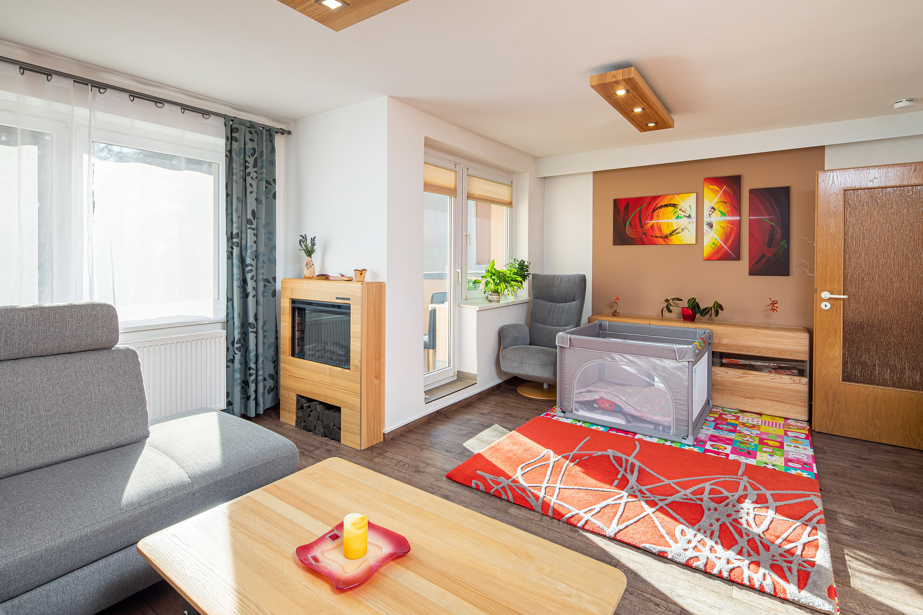 Das an die Küche grenzende Schlafzimmer mit Morgensonne bietet ausreichend Stellflächen für einen deckenhohen Kleiderschrank. Das daran anschließende Arbeits- oder Kinderzimmer ist ein Durchgangszimmer in das hinterste Zimmer, das als zweites Kinderzimmer oder Hobbyraum genutzt werden kann.