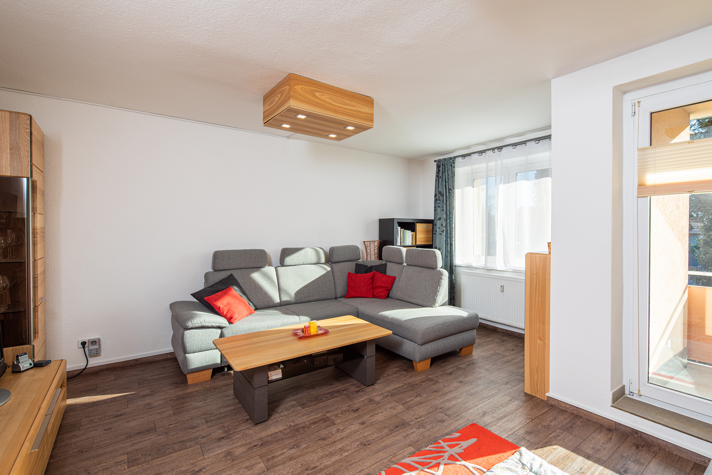 Das 23 m2 große Wohnzimmer mit Laminat in dunkler Holzoptik liegt rechterhand vom Flur in Süd-West-Lage und bietet einen ganztägigen Sonnenplatz auf dem davon abgehenden Balkon. Die daneben liegende kompakte Küche bietet einen Essplatz für 3 Personen. Die auf den Fotos zu sehende Einbauküche wurde von den Mietern installiert und ist nicht Bestandteil des Kaufs.