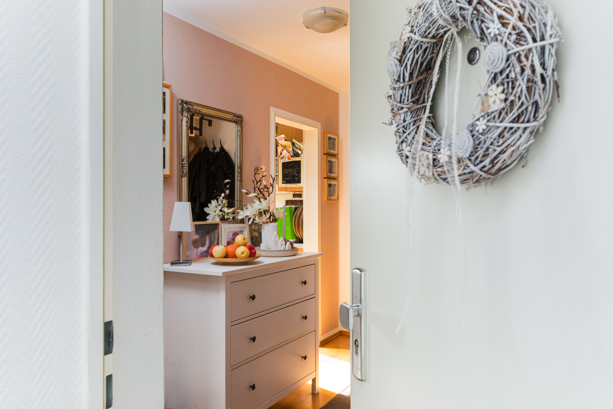 Der großzügige Flur bietet ausreichend Platz für eine Garderobe und Schuhschränke, was für eine einladende und aufgeräumte Atmosphäre sorgt.