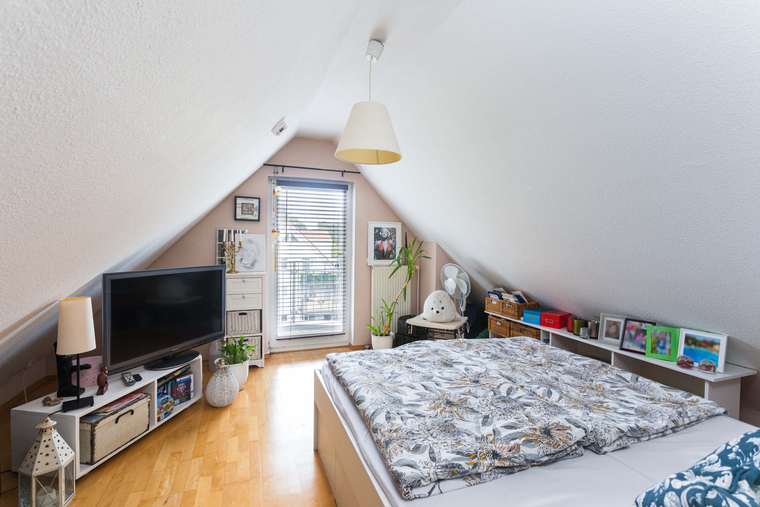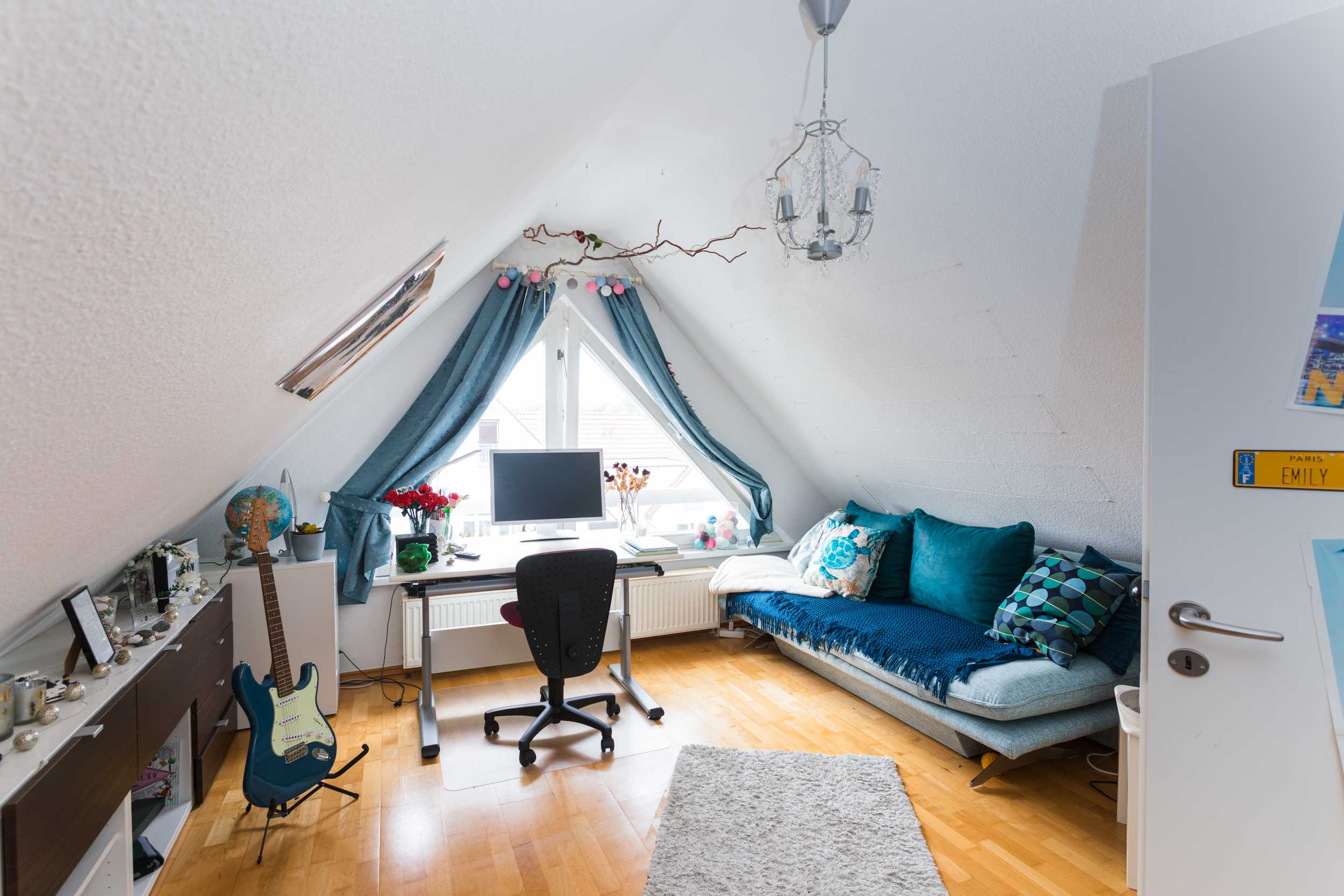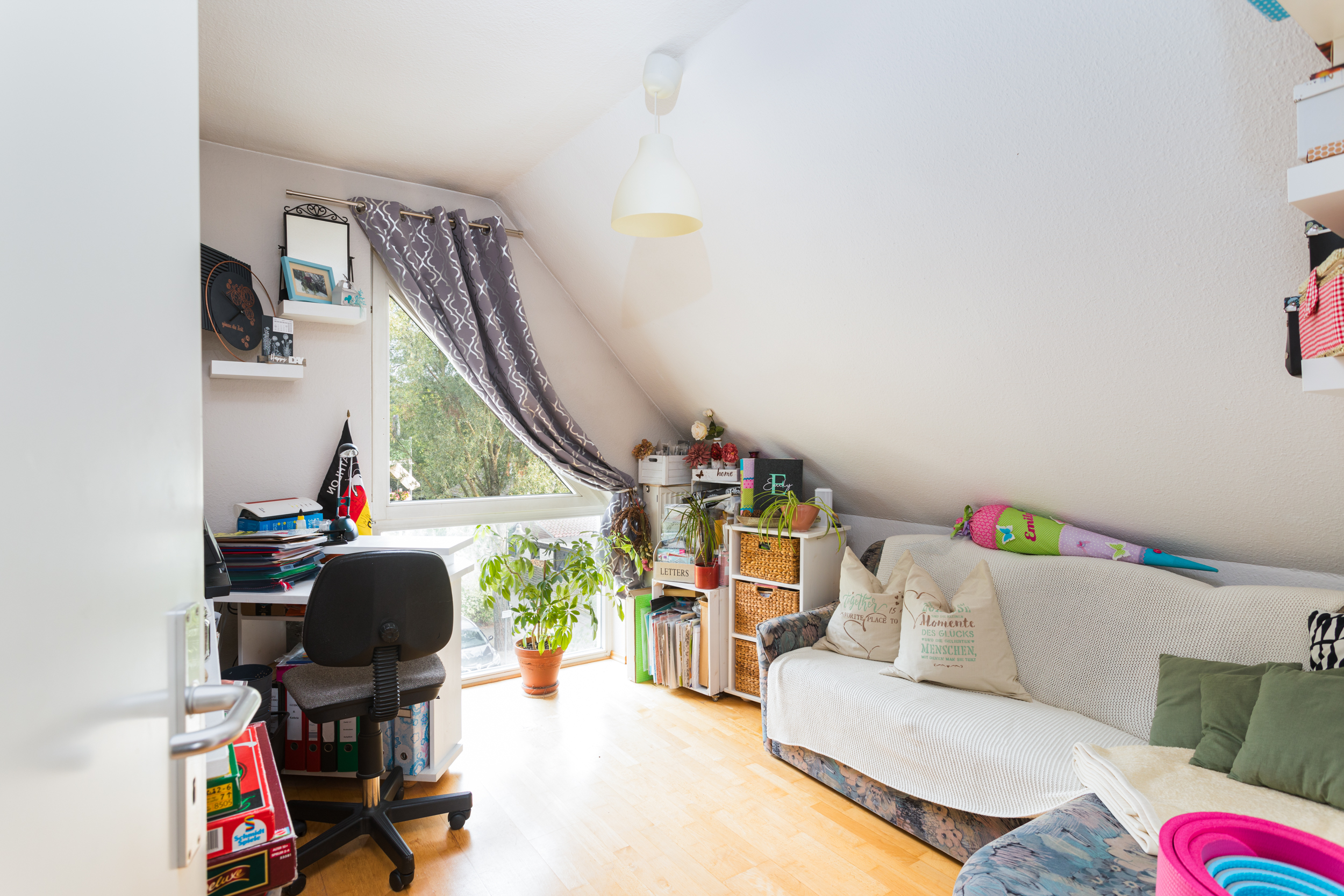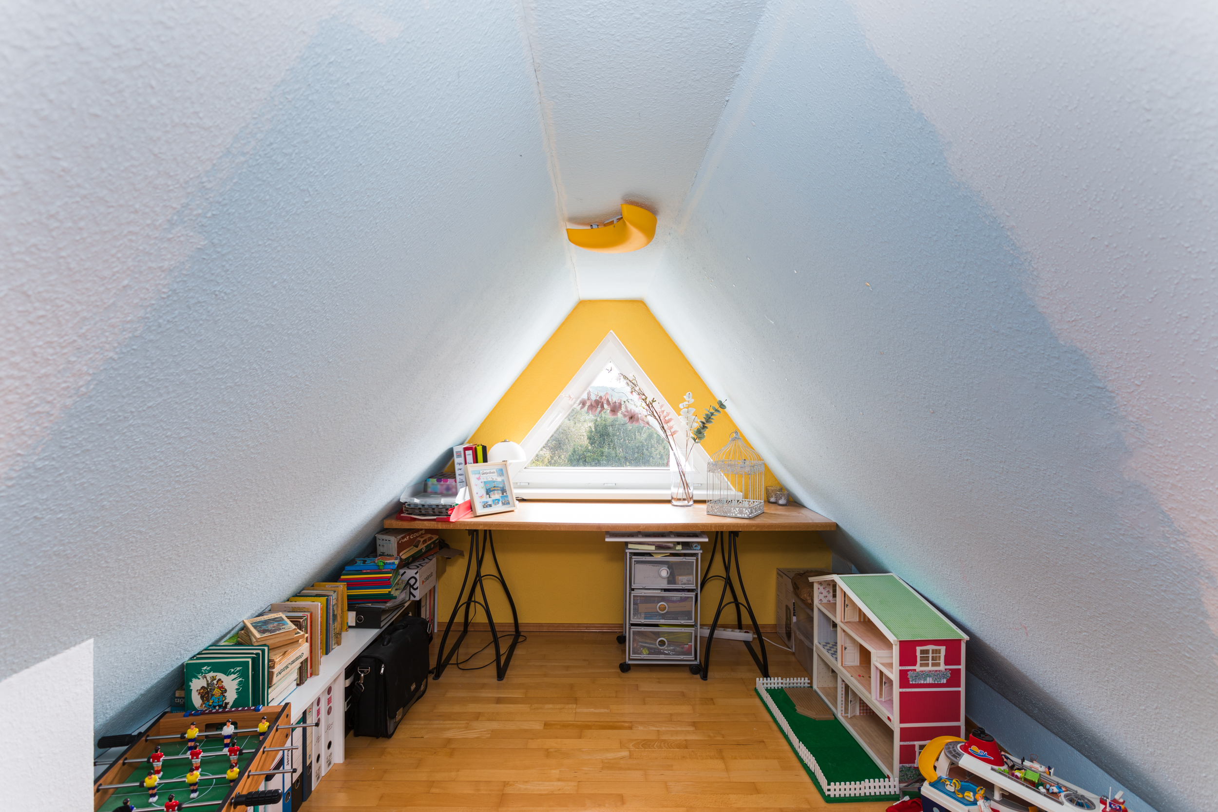 Vom Studio aus gelangt man in ein weiteres Zimmer, das derzeit als Kinderzimmer genutzt wird. Auch hier sorgt der unverbaubare Ausblick für ein angenehmes Wohngefühl. Zudem bietet der Kriechzugang zu einer weiteren Gaube, die als voll ausgebauter Hobbyraum oder Spielehöhle für Kinder dient, zusätzliche Nutzungsmöglichkeiten.