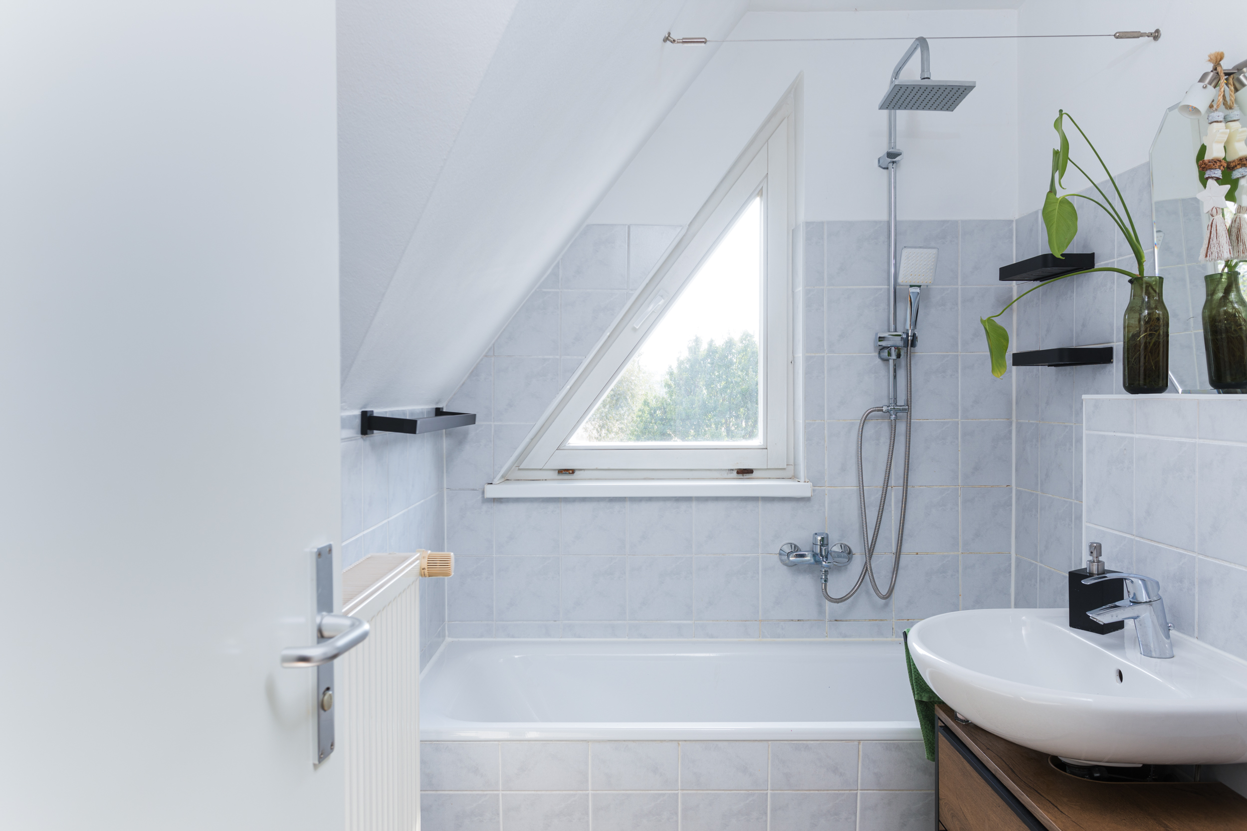 Das moderne Badezimmer überzeugt durch seine zeitlose Gestaltung und bietet mit einer Badewanne und Duscharmatur den perfekten Mix für entspannte Abendbäder oder erfrischende Morgenduschen. Ein Fenster sorgt für ausreichend Belüftung und Helligkeit.
