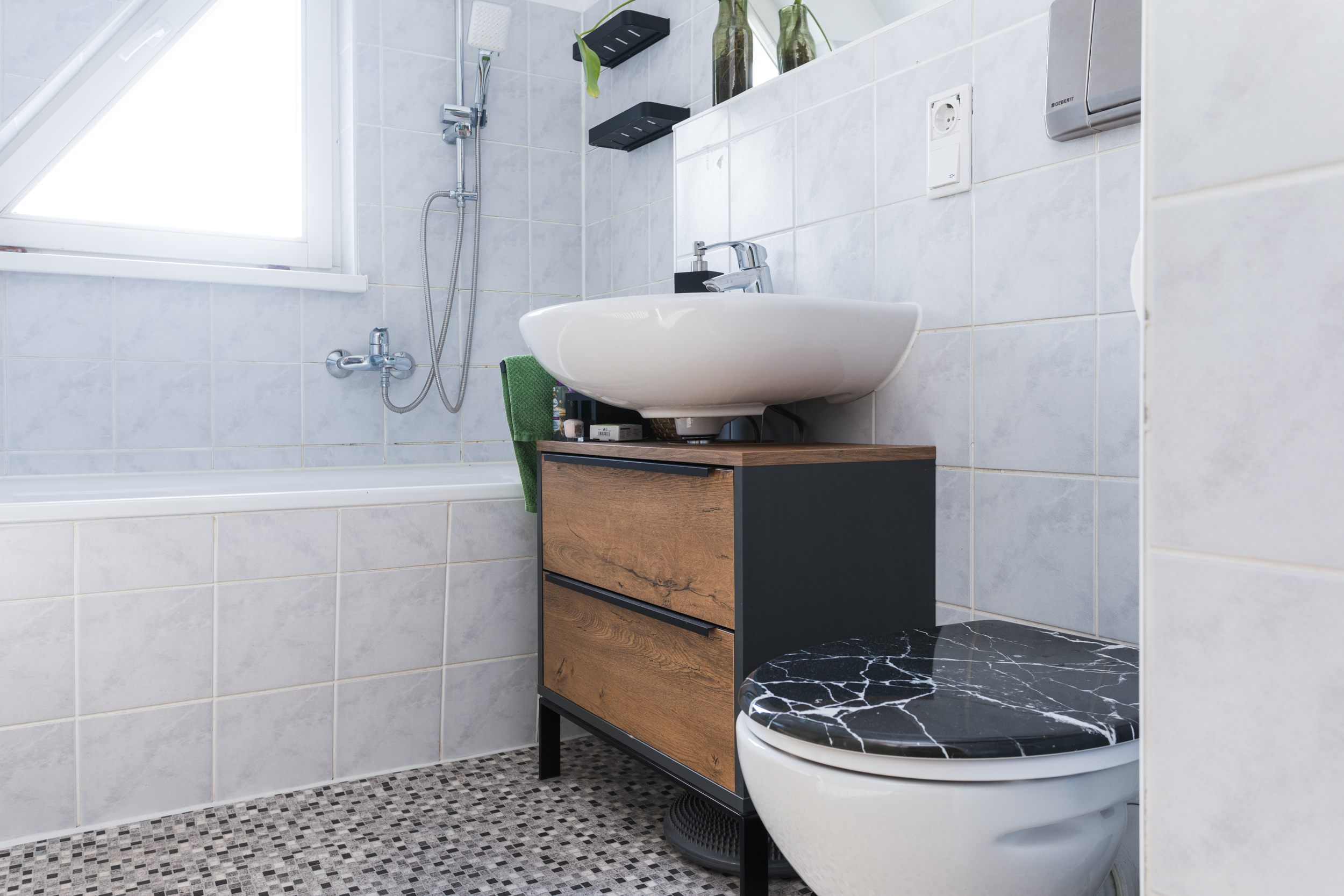 - Bad halbhoch gefliest.