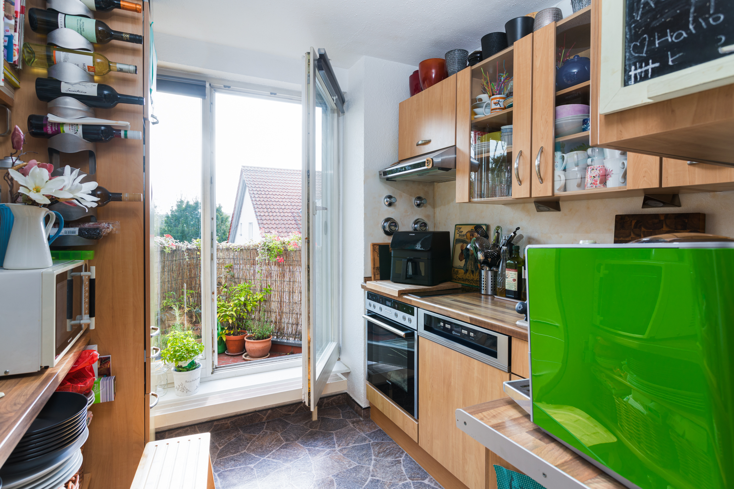 Die Einbauküche ist voll ausgestattet und bietet Raum für alle wichtigen Geräte. Ein kleiner Frühstücksbalkon lädt zu entspannten Morgenstunden mit dem ersten Kaffee des Tages ein.