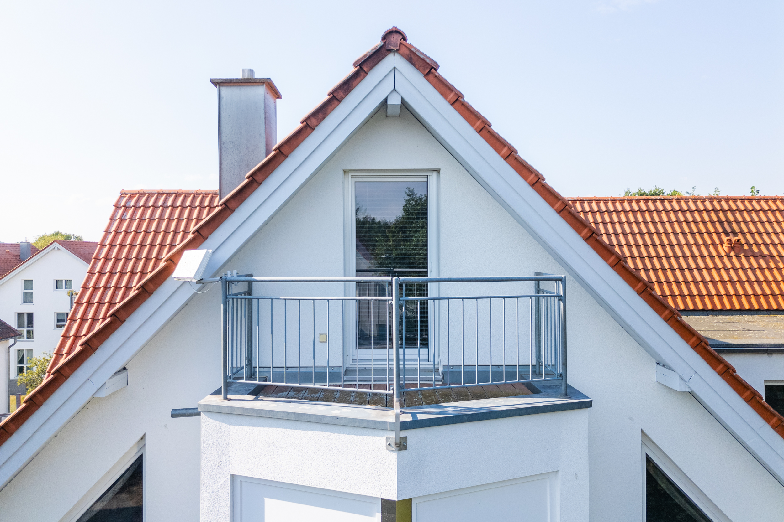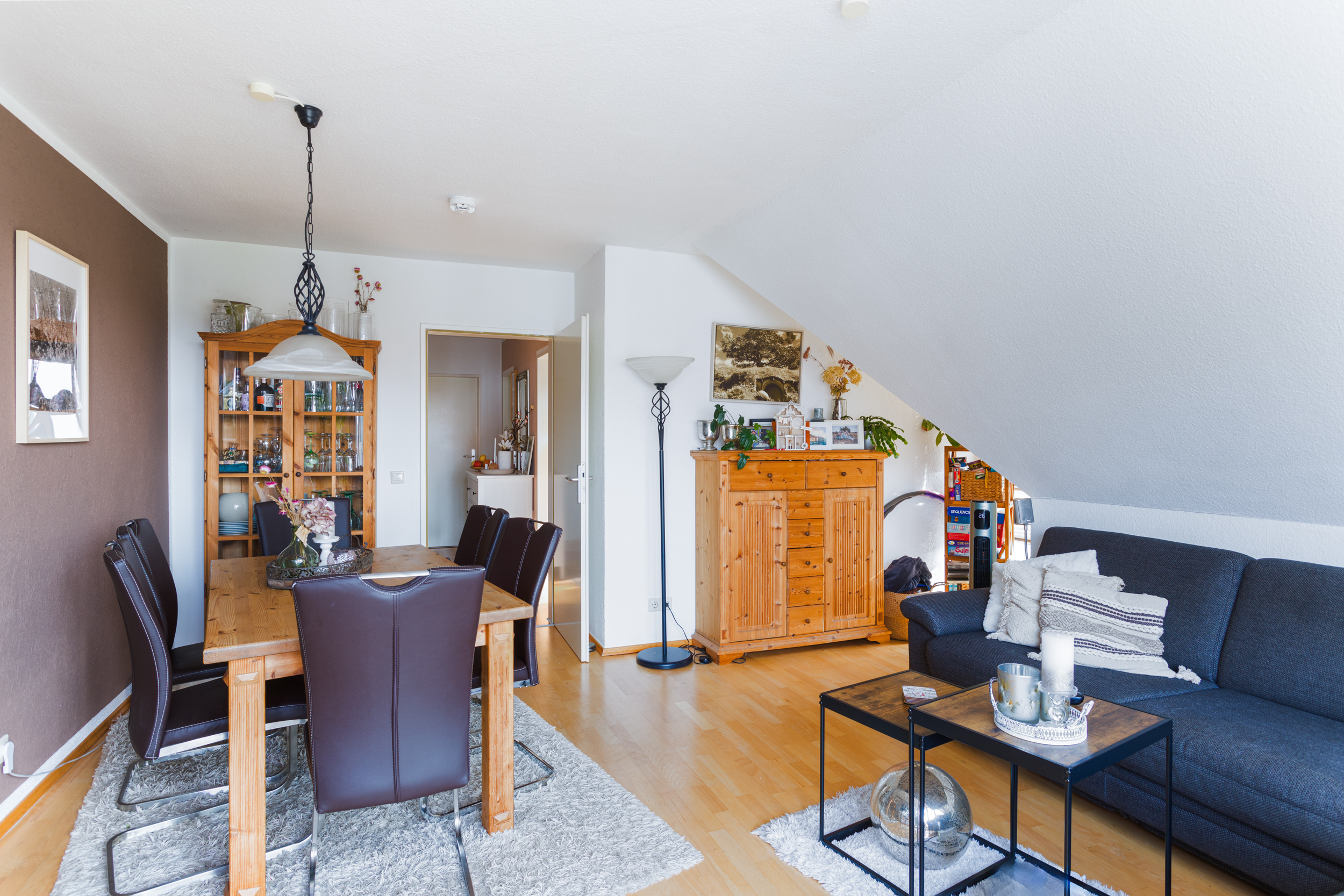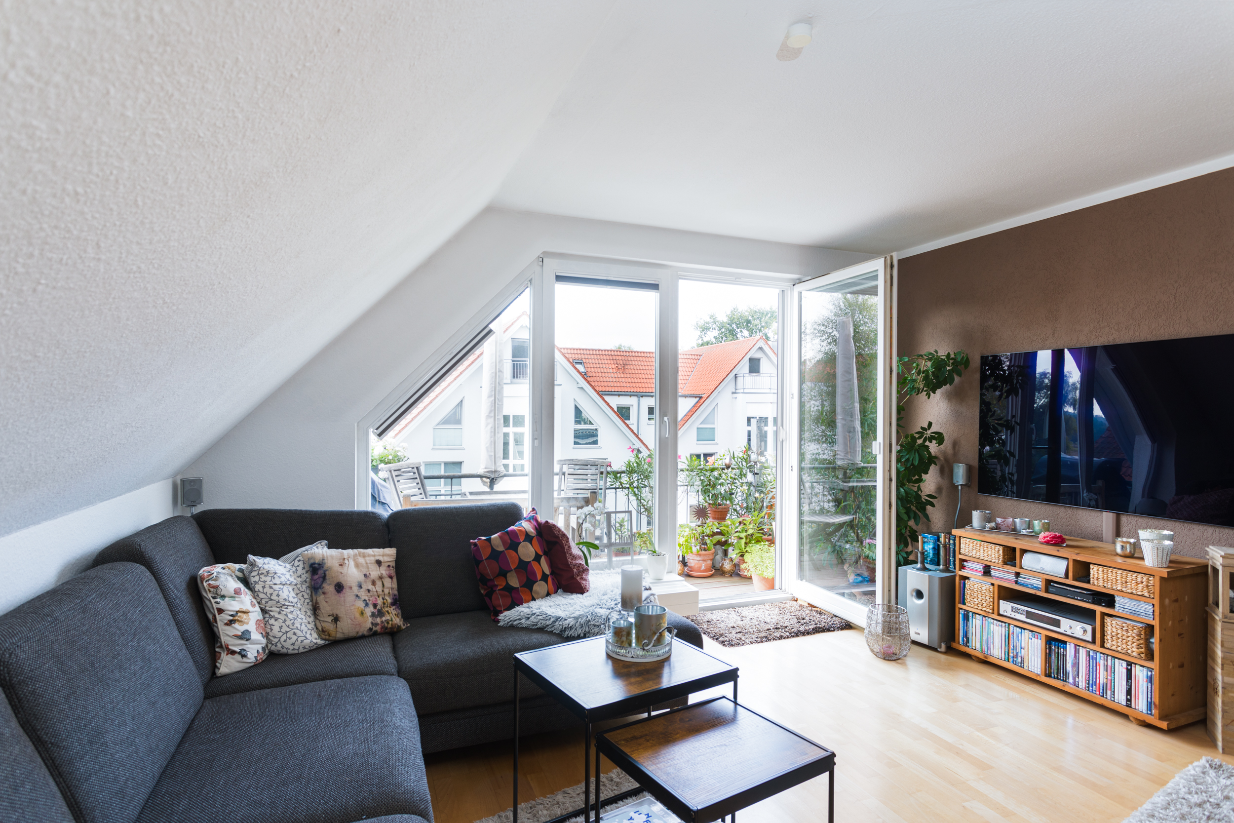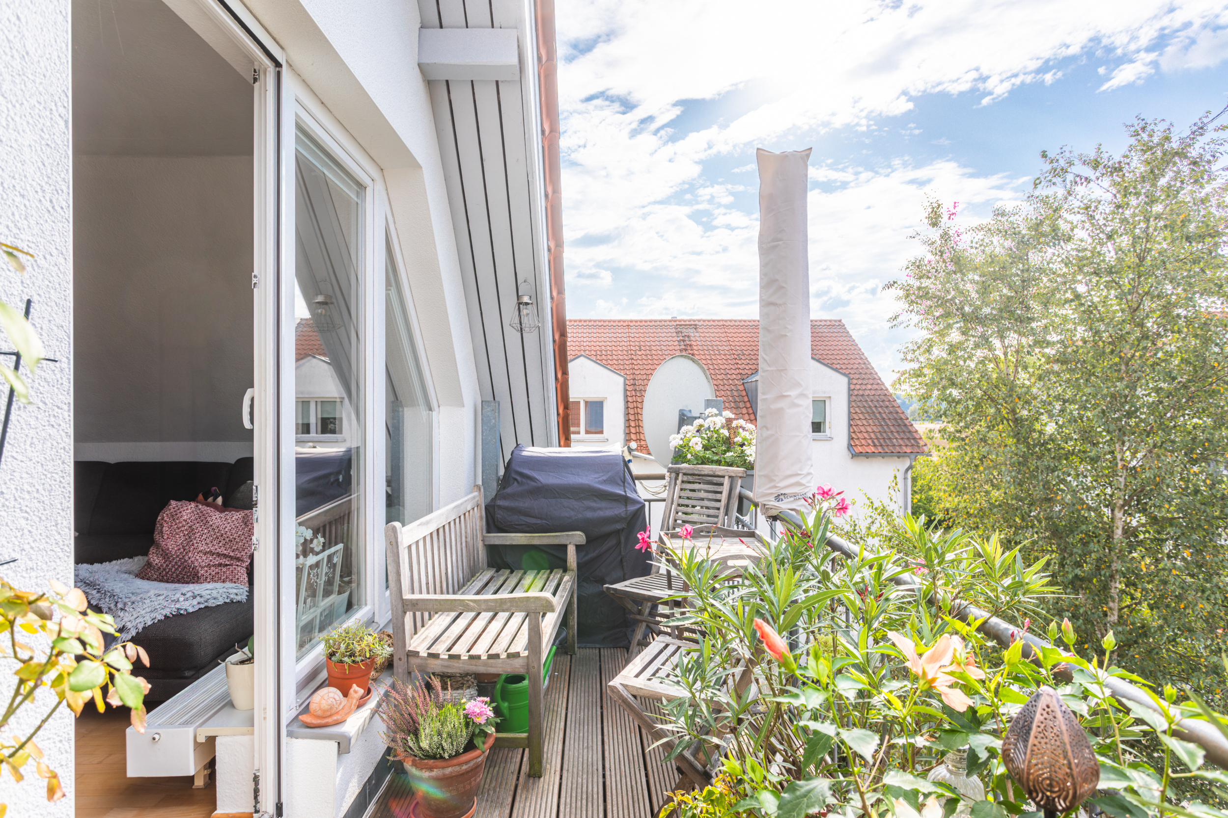 Der zentrale Wohnbereich ist ein Wohlfühlort für die ganze Familie. Der Wohn- und Essbereich ist großzügig geschnitten und dank der Dachgauben optimal nutzbar. Vom Wohnzimmer aus führt der Zugang auf den Balkon, der einen unverbaubaren Weitblick auf angrenzende Felder bietet.