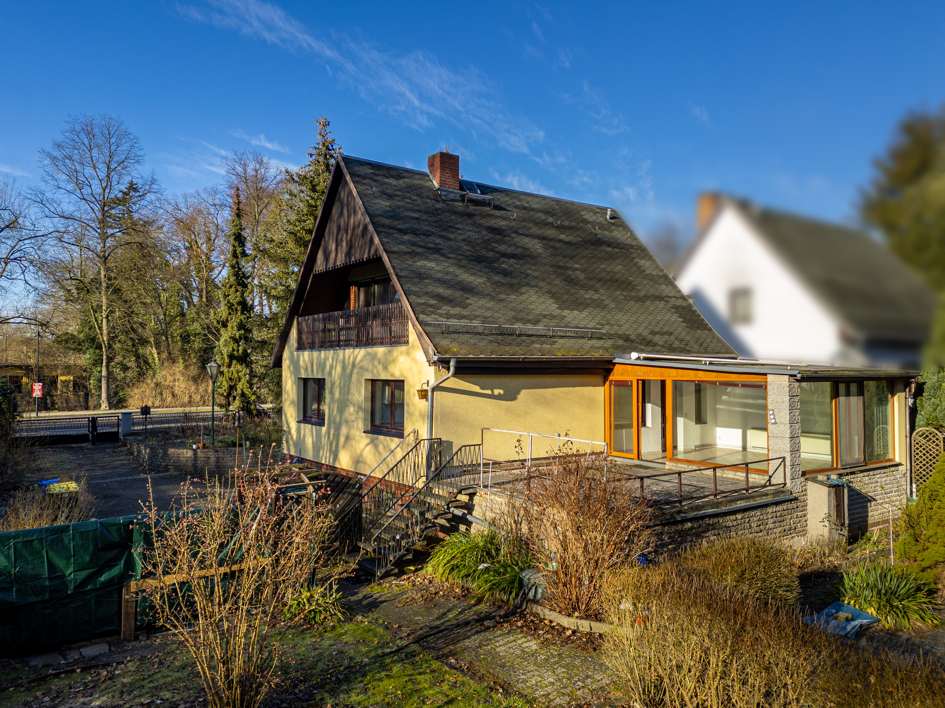 Außenbereich: Neben der Terrasse mit idyllischem Grünblick befindet sich ein angebauter Wintergarten. Der ursprüngliche Hauseingang ist dadurch derzeit nicht als solcher nutzbar, könnte jedoch ohne großen Aufwand seiner Bestimmung wieder zugeführt werden. Lediglich ein Tausch der Wintergartentür ist hierfür nötig.