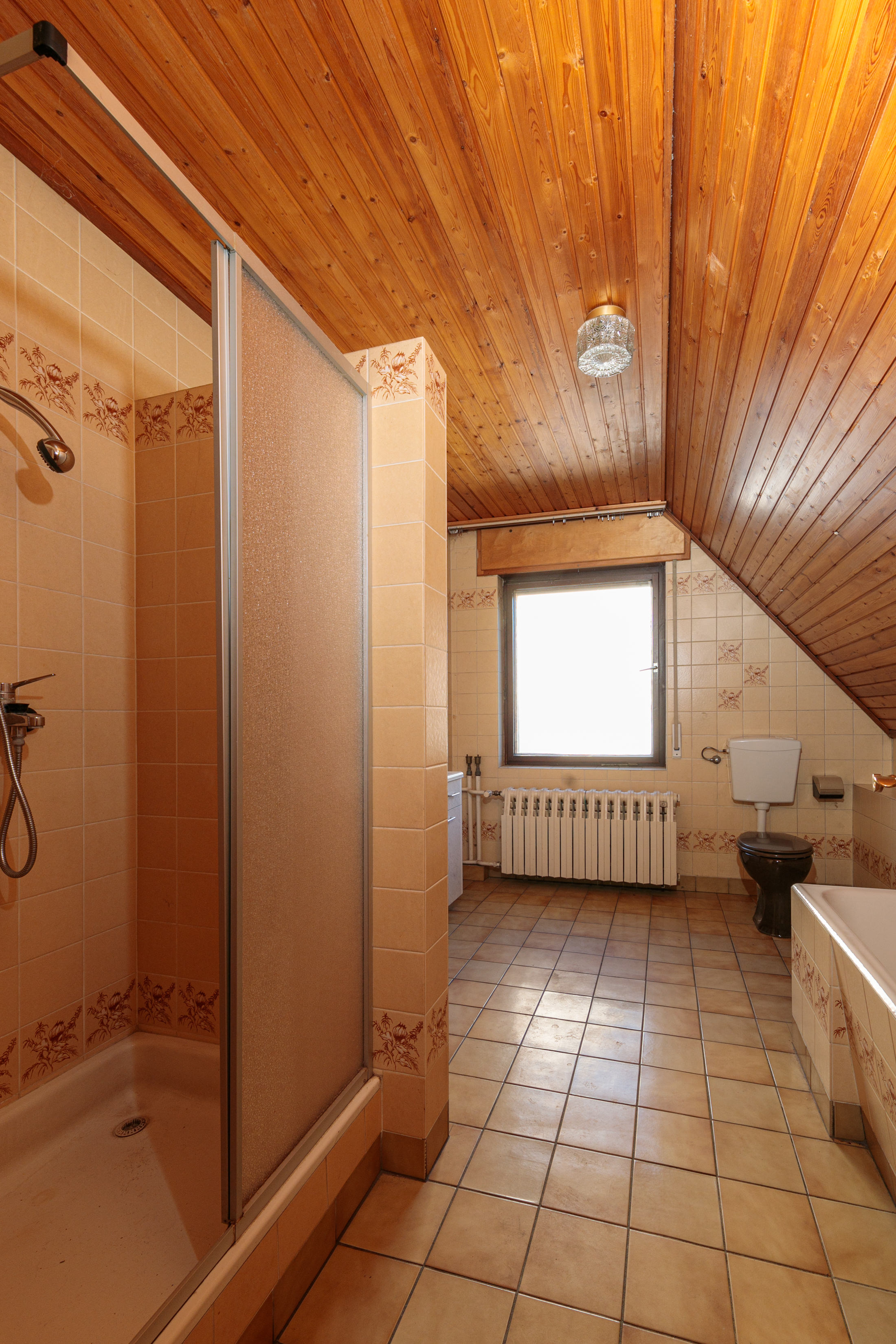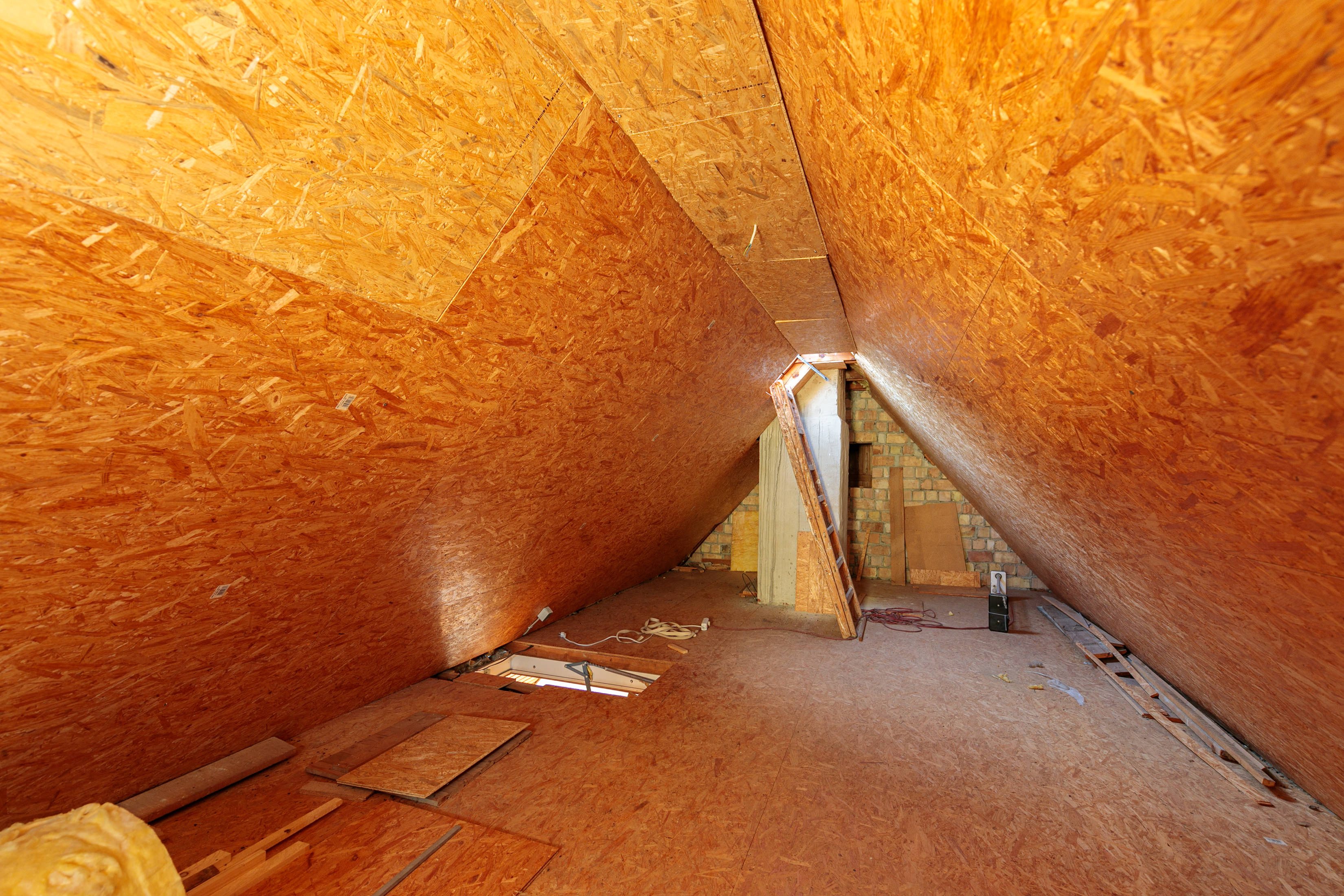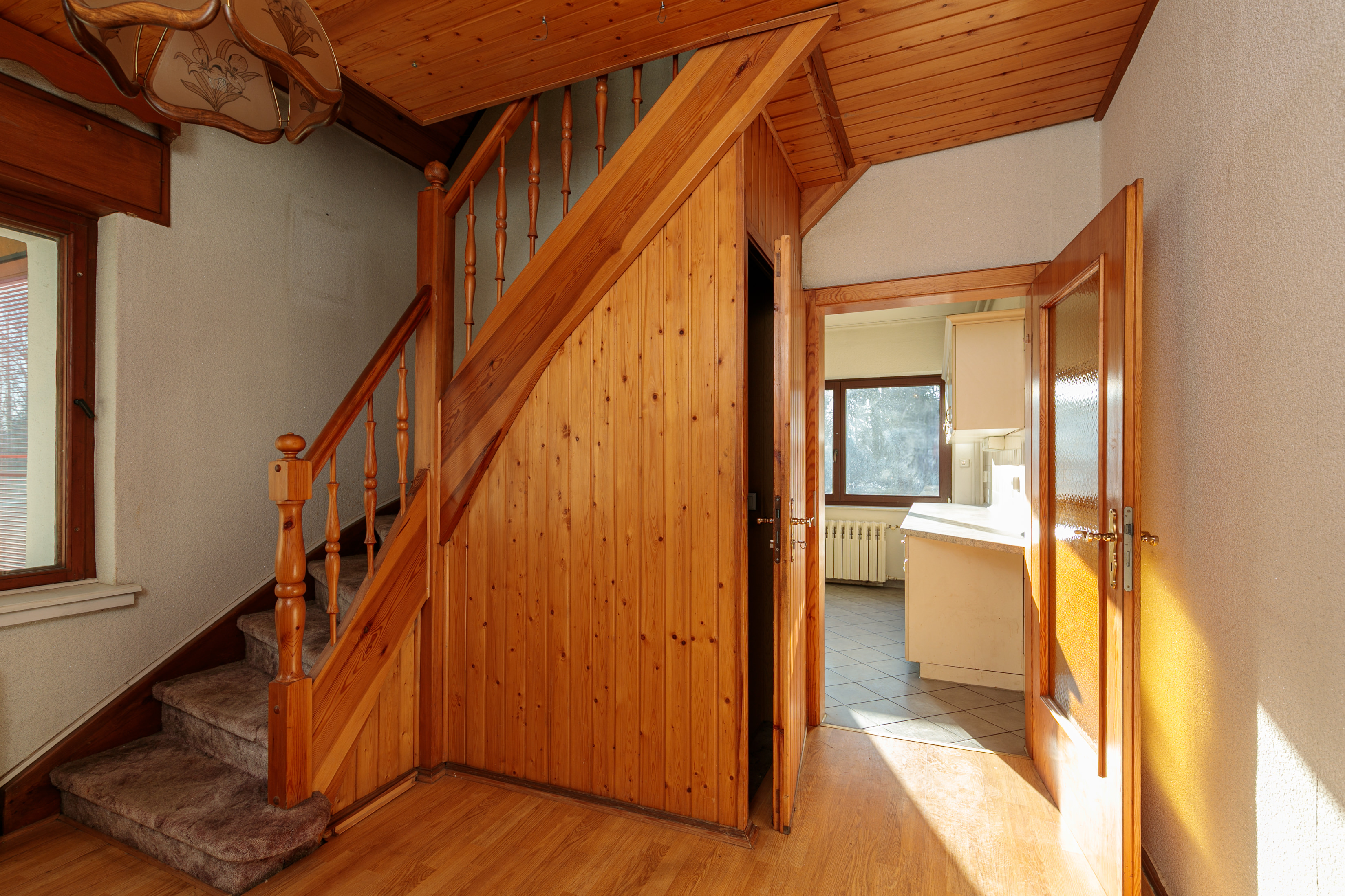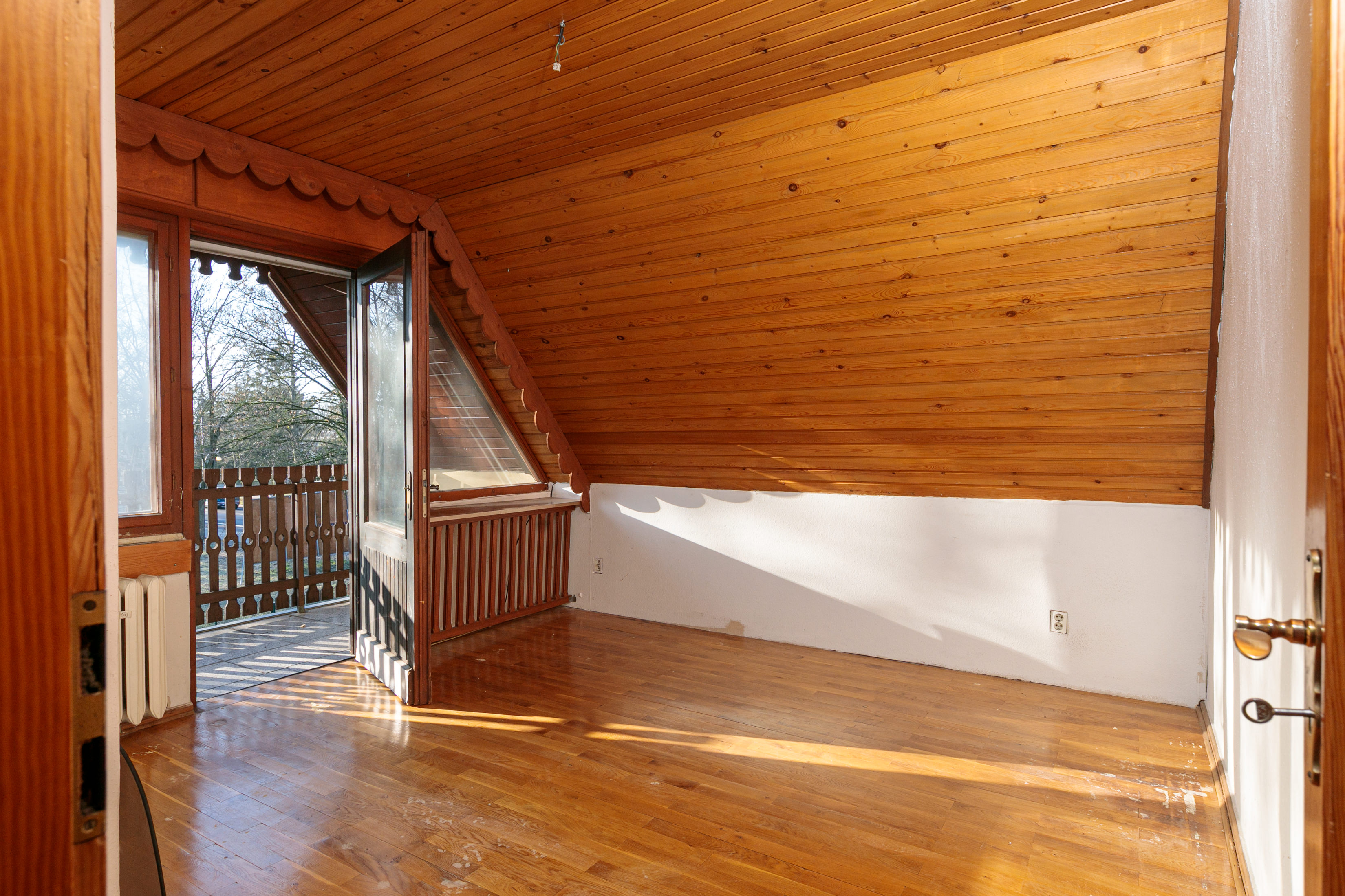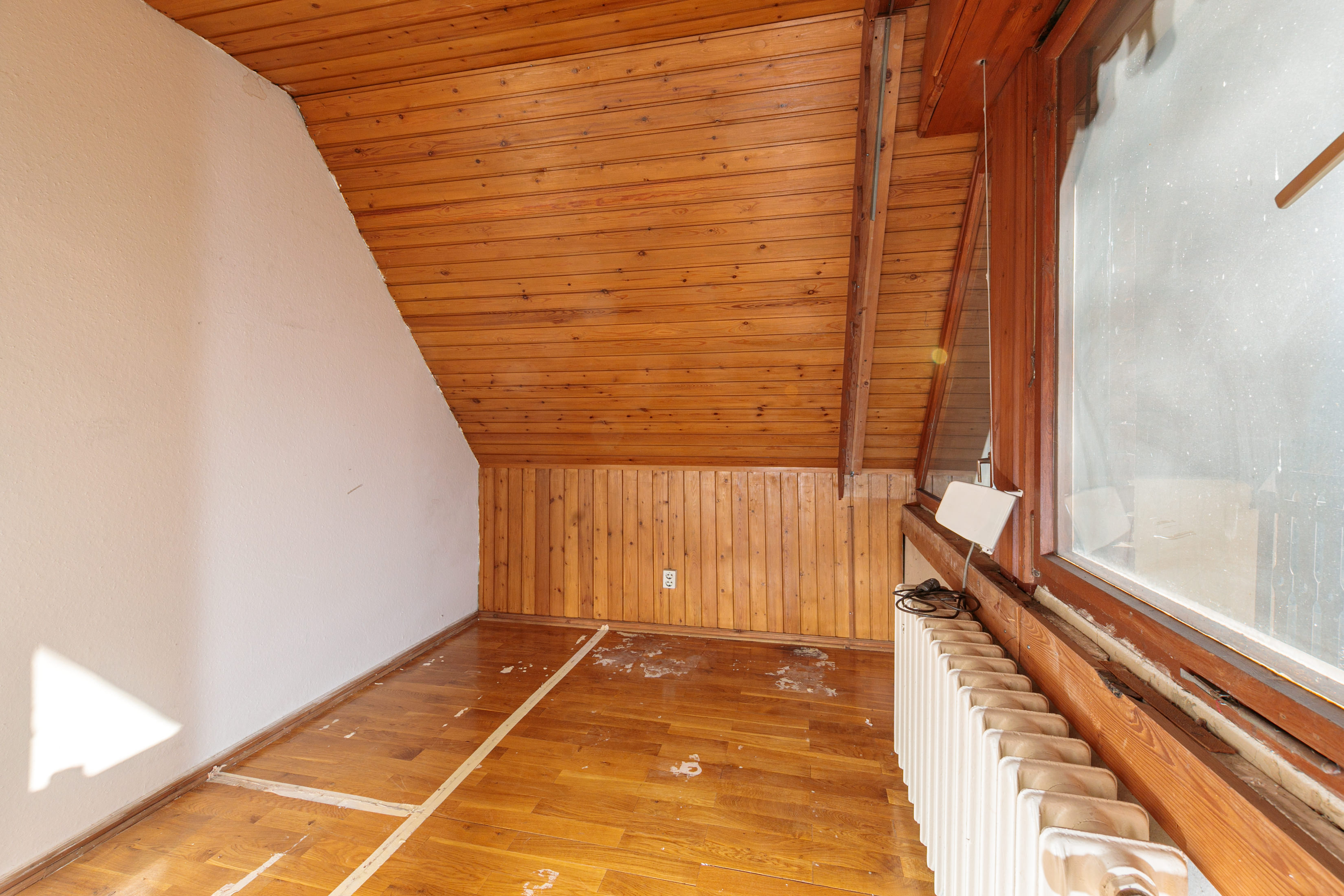 - Dachschrägen und Hobbyraum mit Holzpaneelen verkleidet.