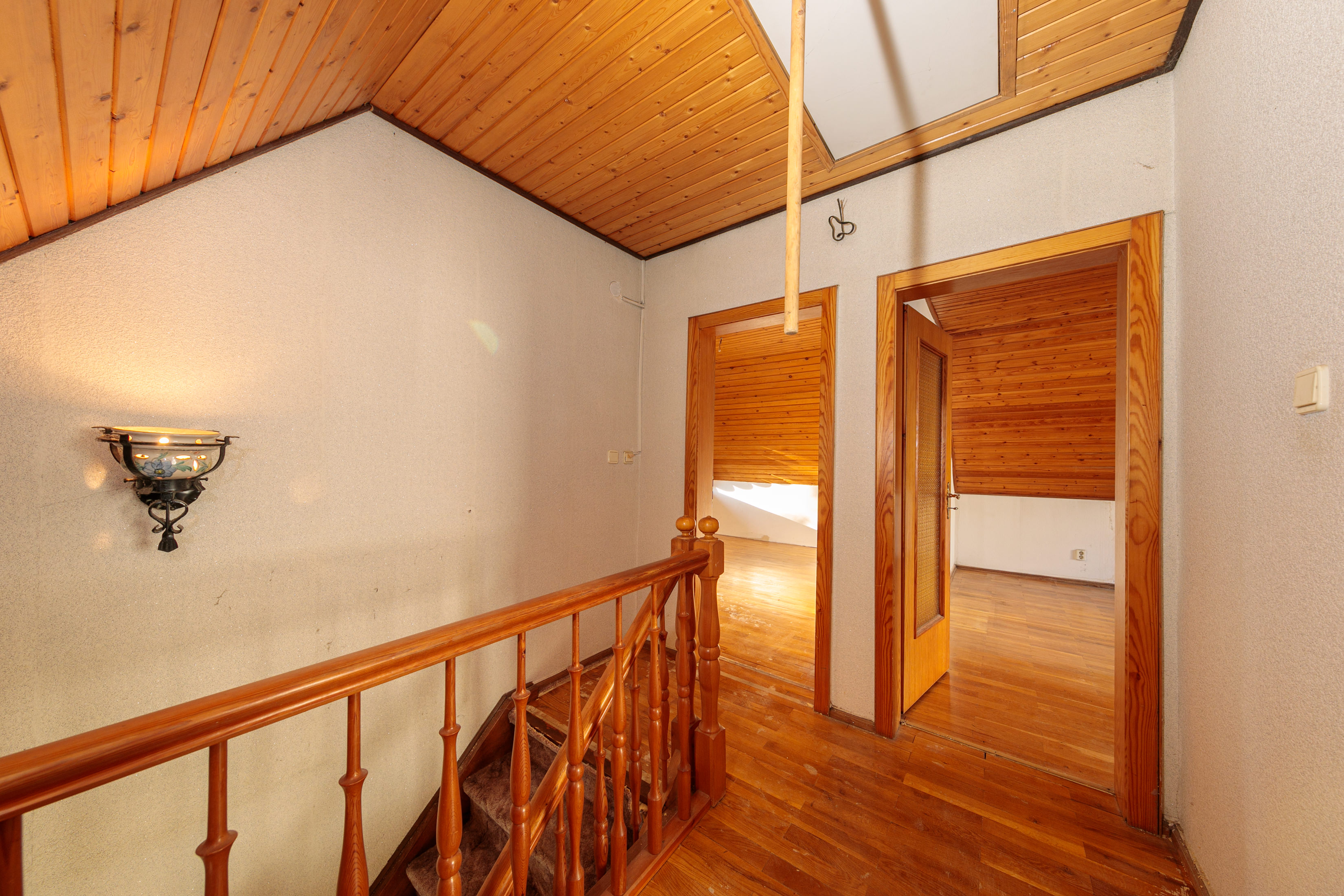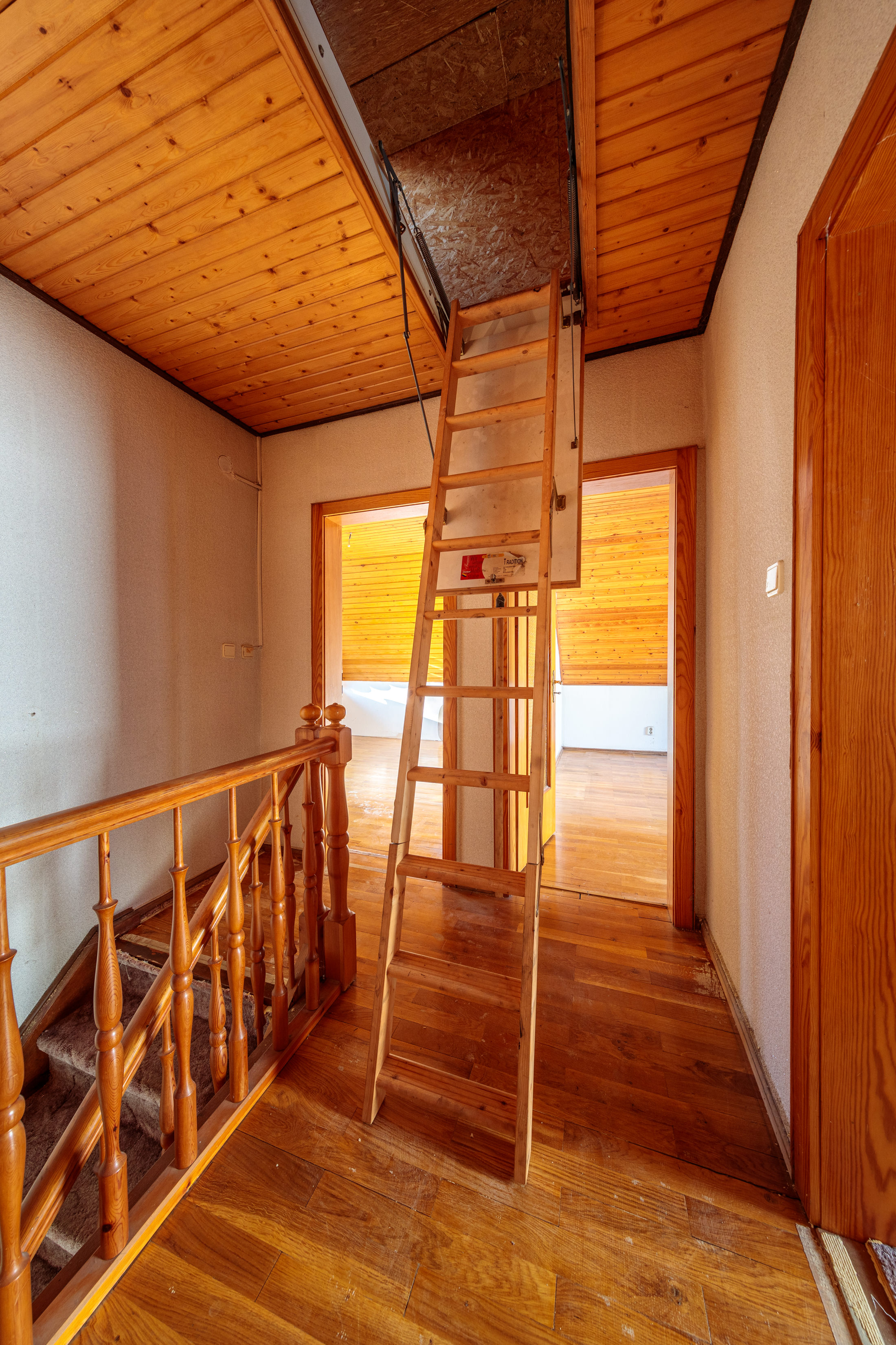Obergeschoss: Eine viertel gewendelte Holztreppe führt ins Obergeschoss. Dort verbindet ein Flur alle Zimmer sowie den Zugang zum Dachboden. Auch in diesem Bereich des Hauses wurde hochwertiges Echtholzparkett verlegt. Aktuell befinden sich hier zwei große Schlafzimmer. Eines davon verfügt über einen direkten Zugang zur Dachloggia.