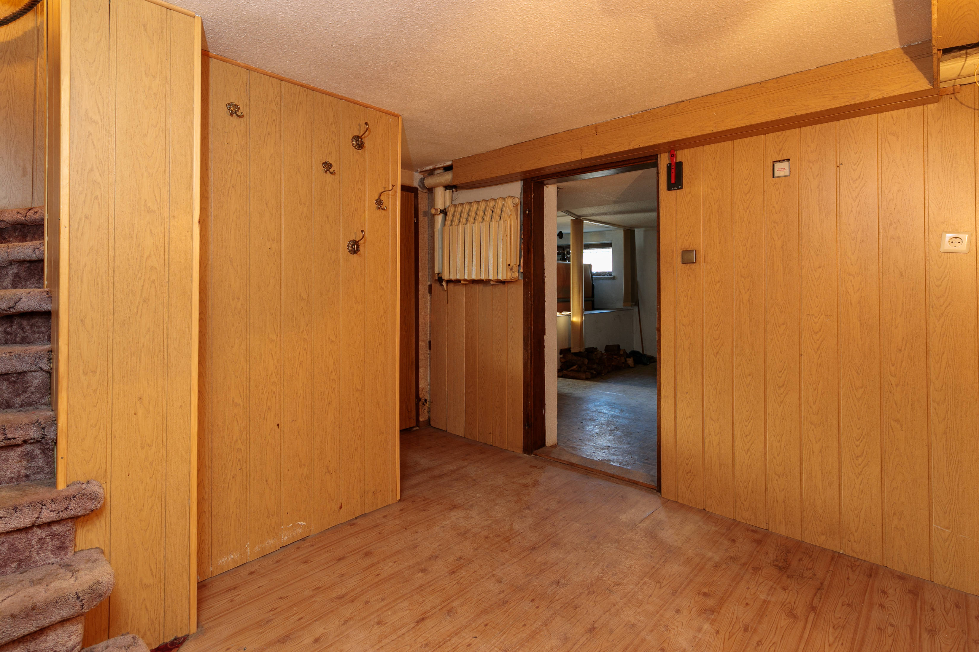 Kellergeschoss: Das Haus ist voll unterkellert. Ein großer Flur bietet praktische Abstellmöglichkeiten und wird über die Geschosstreppe aus dem Erdgeschoss erreicht. Gegenüber des Treppenfußes befindet sich ein Durchgang, der rechterhand zum ehemaligen Außenzugang des Kellers und linkerhand zu einem großzügigen Hobbyraum mit Tagesbelichtung führt. Dieser Raum eignet sich hervorragend als Gäste- oder Arbeitsbereich oder wie bisher als Hobbyraum.