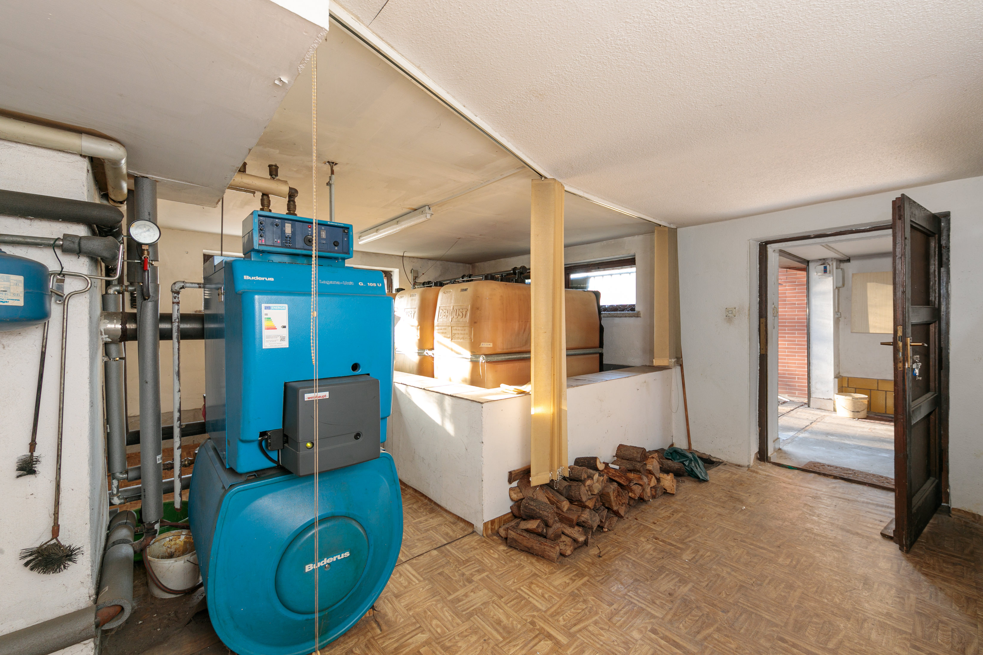 Ein weiterer großer Raum im Keller beherbergt neben einer Werkbank die Heizungsanlage und die Öltanks. Bei einer Umstellung der Heizung ergibt sich auch hier potenzieller Raumgewinn.