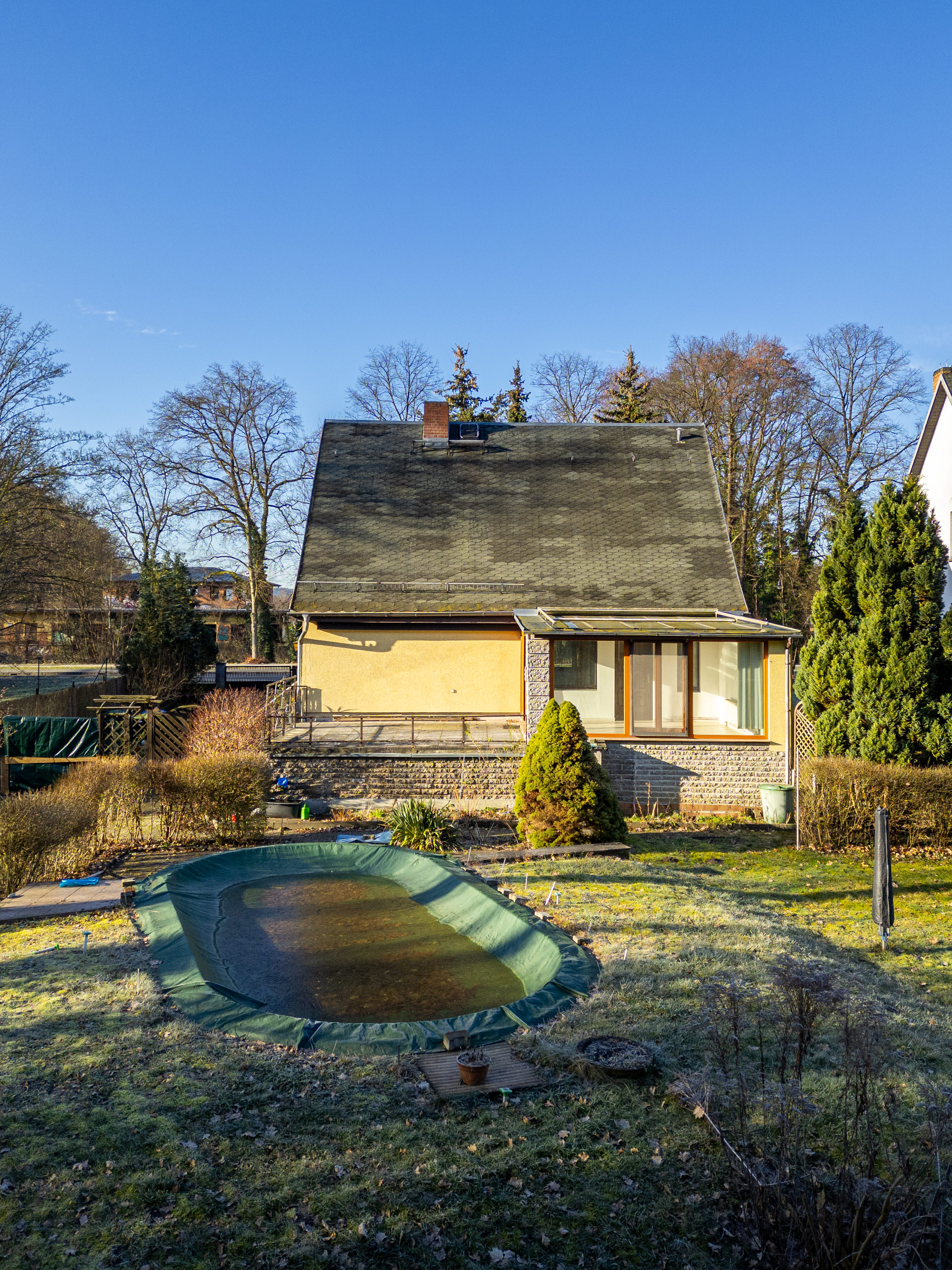Auf dem weitläufigen Grundstück befinden sich ein Gartenhaus, ein Pool und ein Gewächshaus. Mit entsprechender Pflege und Modernisierung können diese Anlagen wieder in ihrem alten Glanz erstrahlen und das Grundstück um wertvolle Erholungs- und Abstellmöglichkeiten erweitern.
